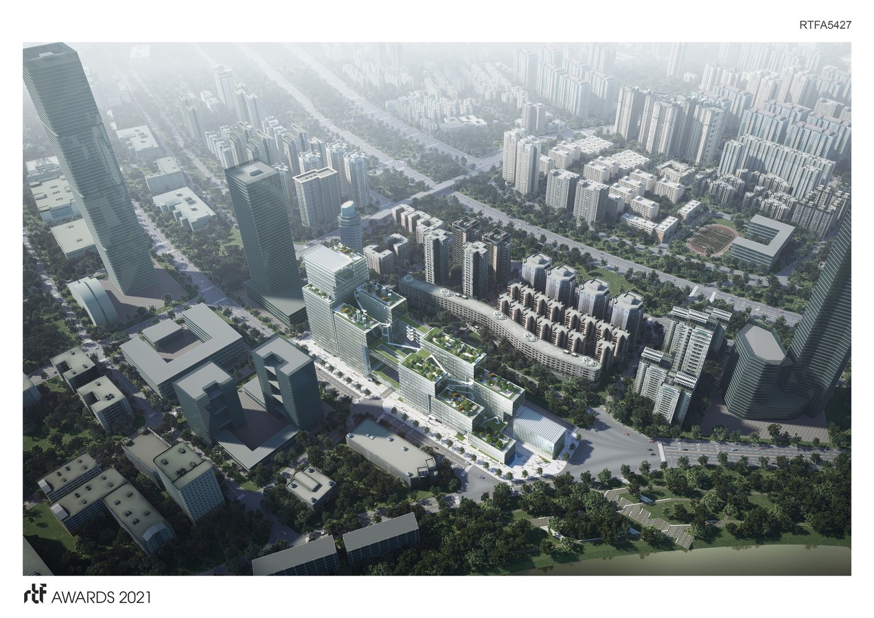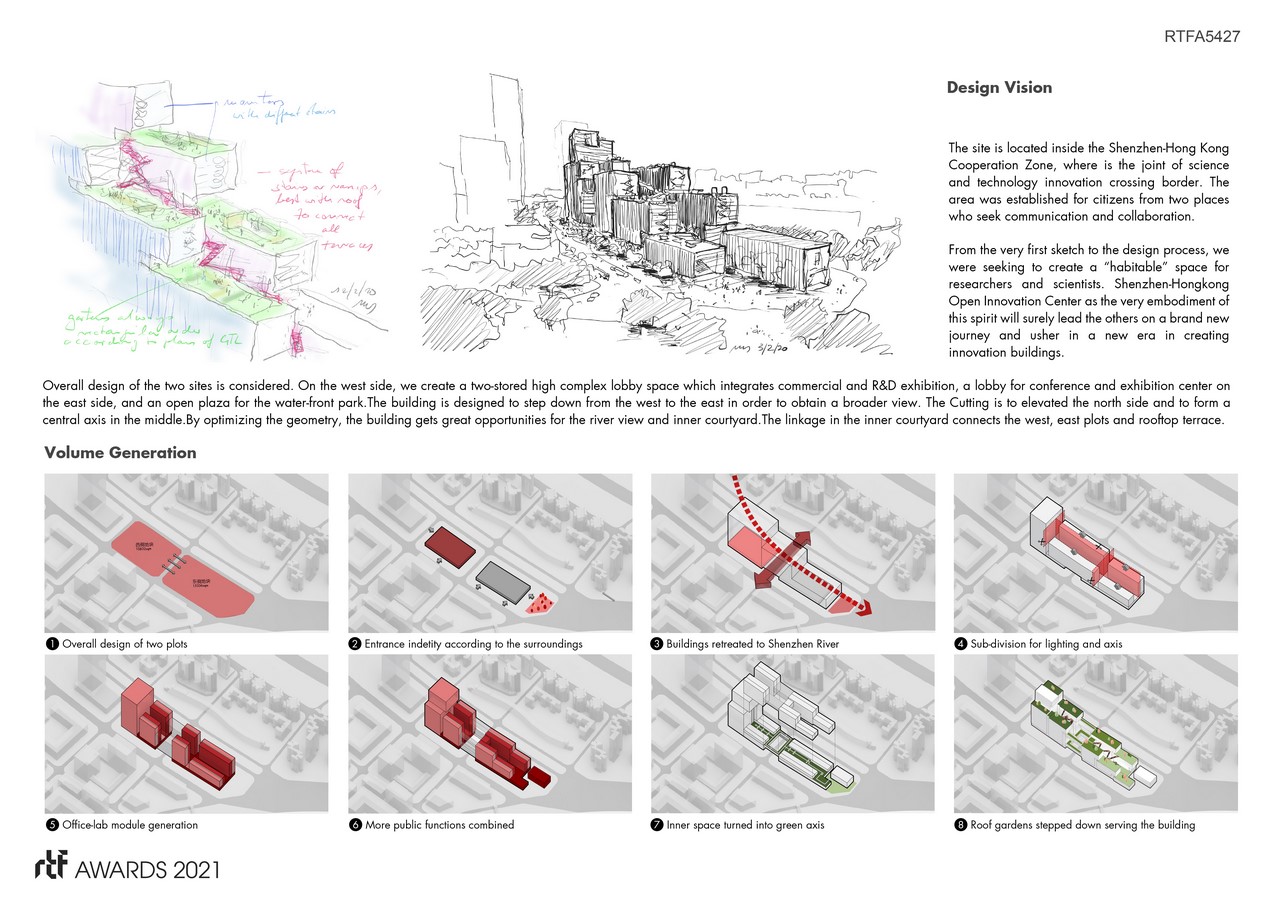 Shenzhen-Hong Kong Open Innovation Center is the key project of “West Wing” of Shenzhen-Hong Kong Cooperation Zone. We seek an integrated design method, and plan the two plots in a unified way, aiming at creating an impressive and remarkable building. The overall volume is formed by two groups of stacking boxes, which face the Shenzhen River and are stacked step by step.