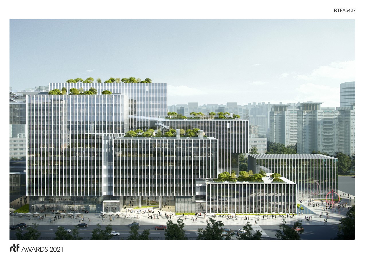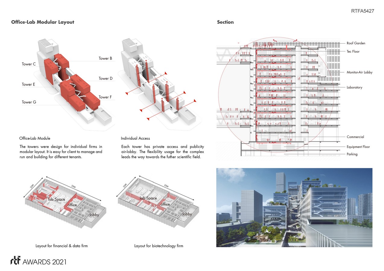 The standard modular office and experimental space are closely connected, and combined with indoor shared communication space. So that it can meet the needs of enterprises to the greatest extent. The facade along the street side is simple and unified with the surrounding high-rise buildings. The glass curtain wall is matched with vertical metal components, which are openable. For the inner side facade, it is more complex. With the reflection of central green axis in the middle, it becomes energetic.