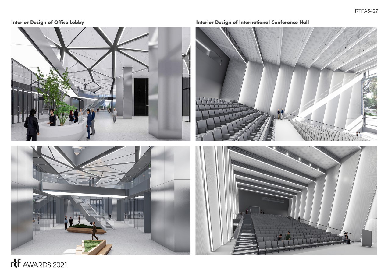 The entrance lobby integrates the functions of business, scientific research exhibition, conference exhibition, leisure and office, etc., to create a compound main lobby with the height of four stories. It becomes the function core that serves the surrounding and upper scientific research spaces. The terraces generated by inner courtyards and stacking boxes become high-quality leisure spaces for all the users of the building.