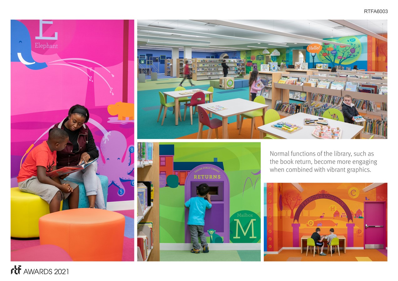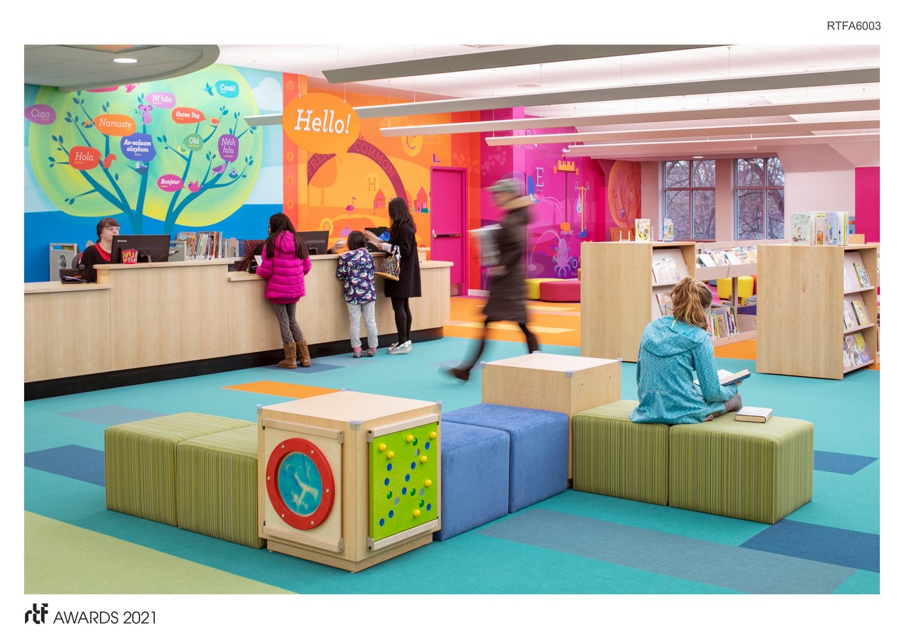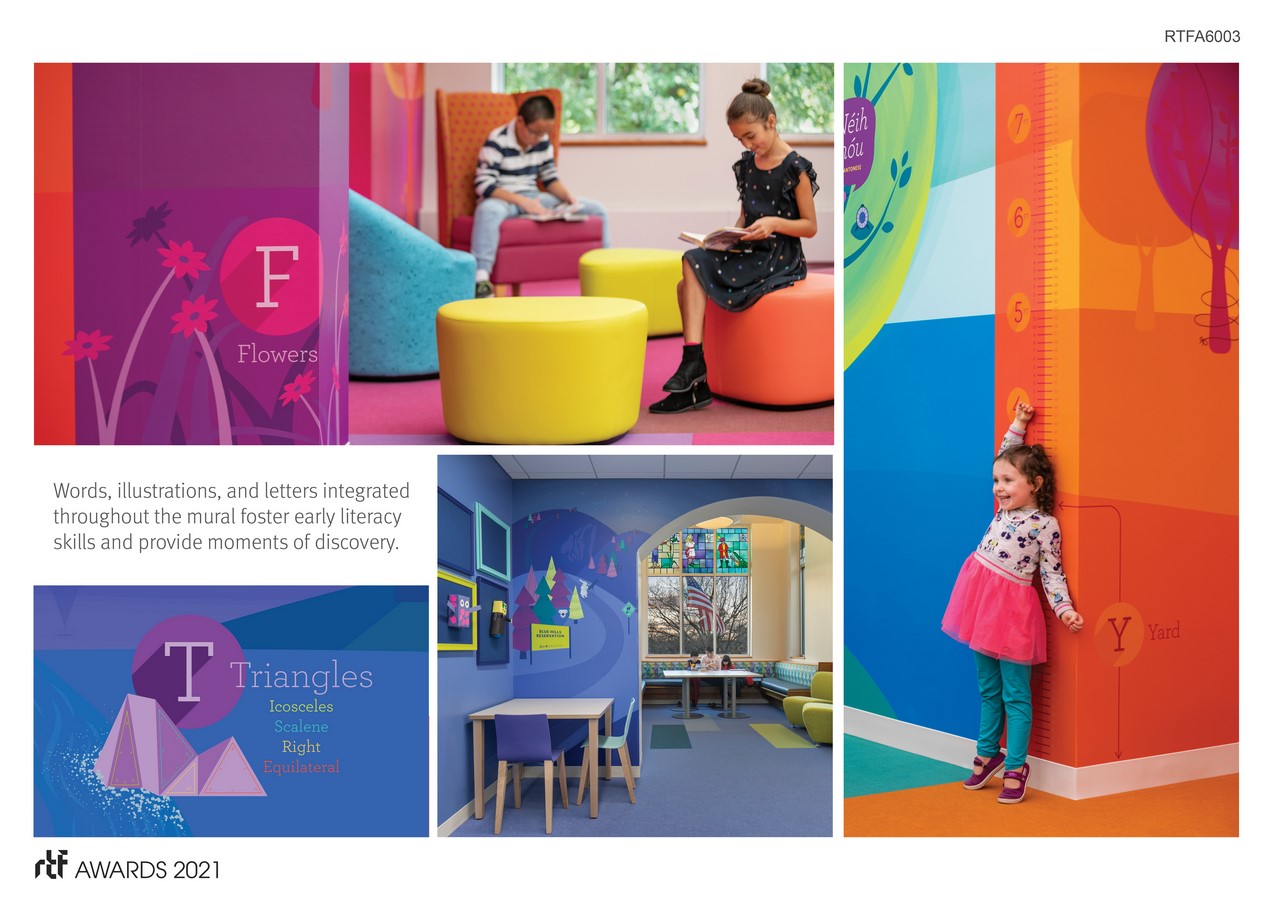 Spanning the entire length of the room, a 111 foot-long custom mural combines local landmarks and history with age-appropriate learning elements for discovery. Numbers and shapes are combined with friendly characters in the Young Readers area. Children can measure themselves and track their growth on the height chart. Local, historical homes are nestled amongst the bookshelves and cleverly integrate a geometry lesson. Designed as an interactive scavenger hunt for library patrons, each letter of the alphabet—along with the five storybook characters—is woven throughout the mural, sparking joy, delight, and wonder for children of all ages.