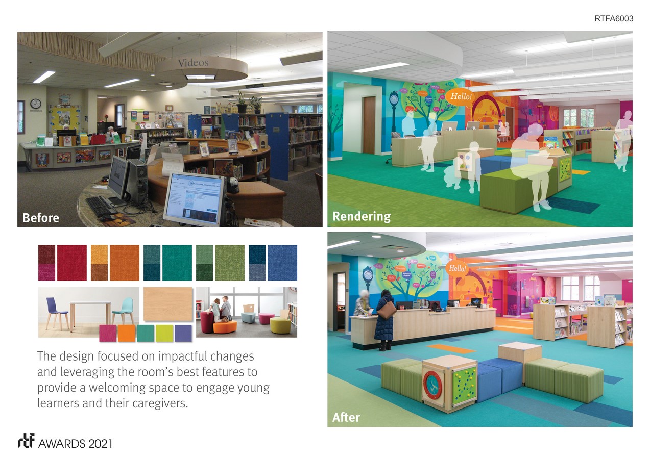 The signage and environmental graphics at the Children’s Library at Thayer Public Library prove that utilizing smart design solutions can meaningfully benefit a community without breaking the bank. This well-loved but well-worn section of the library needed updating to accommodate growing demands, expanded programming, and new technology. The client wanted a vibrant, interactive, and inviting space but had a limited budget. The interior design provides this by focusing on impactful changes and leveraging the room’s best features to offer a welcoming space to engage young learners and their caregivers.