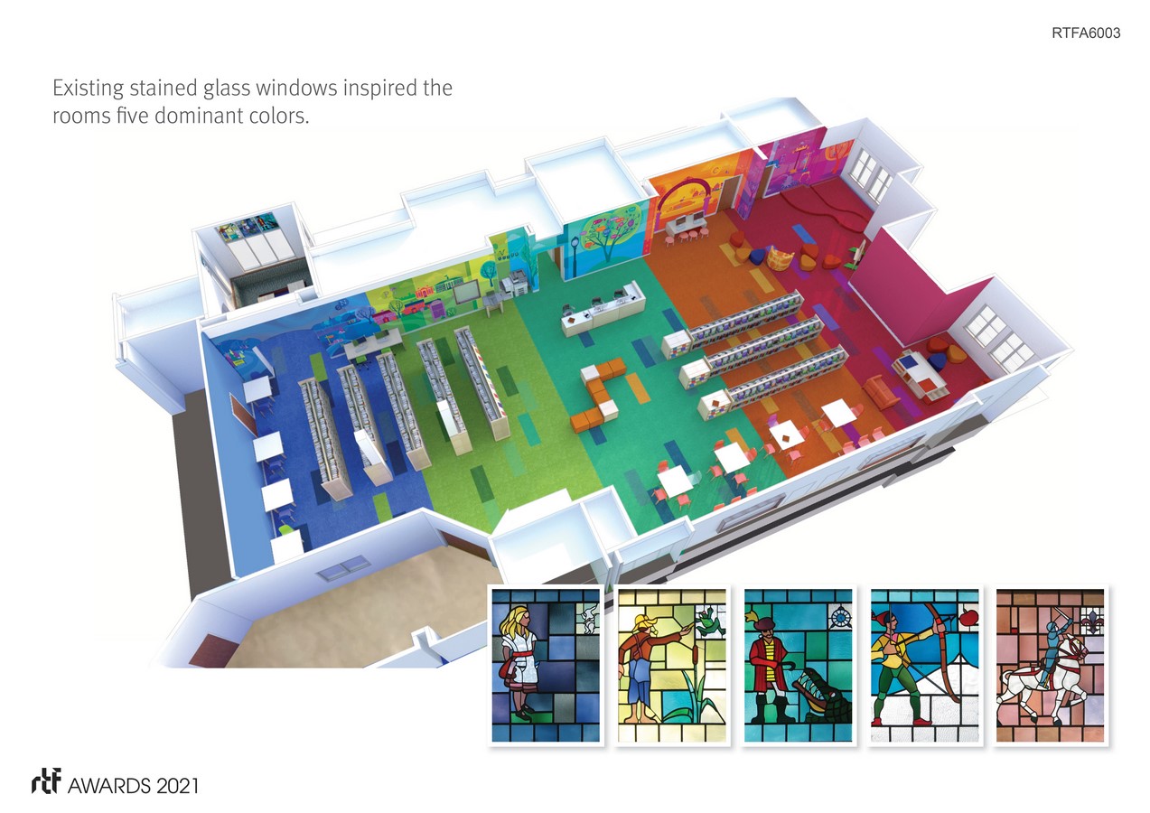 Beloved stained-glass windows, which are original to the space, depict classic storybook characters and inspire the room’s colors and finishes. The five dominant colors, drawn from the stained-glass, create clearly defined zones. Using color theory, warmer colors were placed in the youngest area and transition to calmer blues in the tween area for a more conducive space. The room also features a simple, flexible art wall to display children’s artwork.
