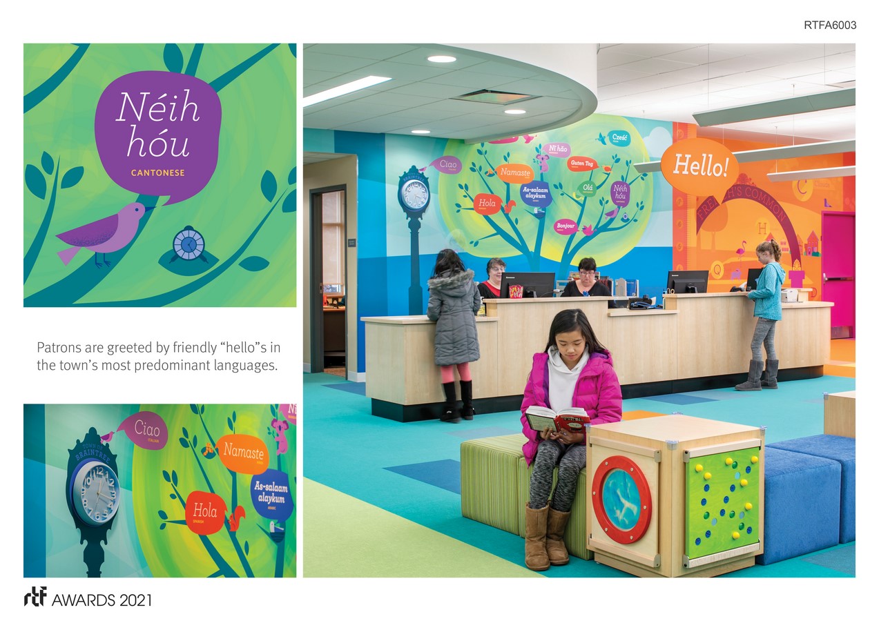 Patrons entering the space are greeted by a friendly “hello” accompanied by “hello”s in the top 11 languages spoken within the community. The greetings are spoken by welcoming creatures nestled within the tree anchoring the circulation desk.