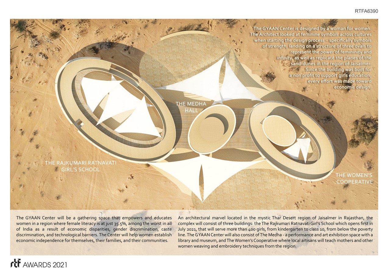 The GYAAN Center is designed by a woman for women. Diana Kellogg Architects looked at feminine symbols across cultures when starting the design process – specifically symbols of strength, landing on a structure of three ovals to represent the power of femininity and infinity, as well as replicate the planes of the sand-dunes in the region of Jaisalmer. Since the building was built for a non-profit to support girls education, every effort was made toward economic design.