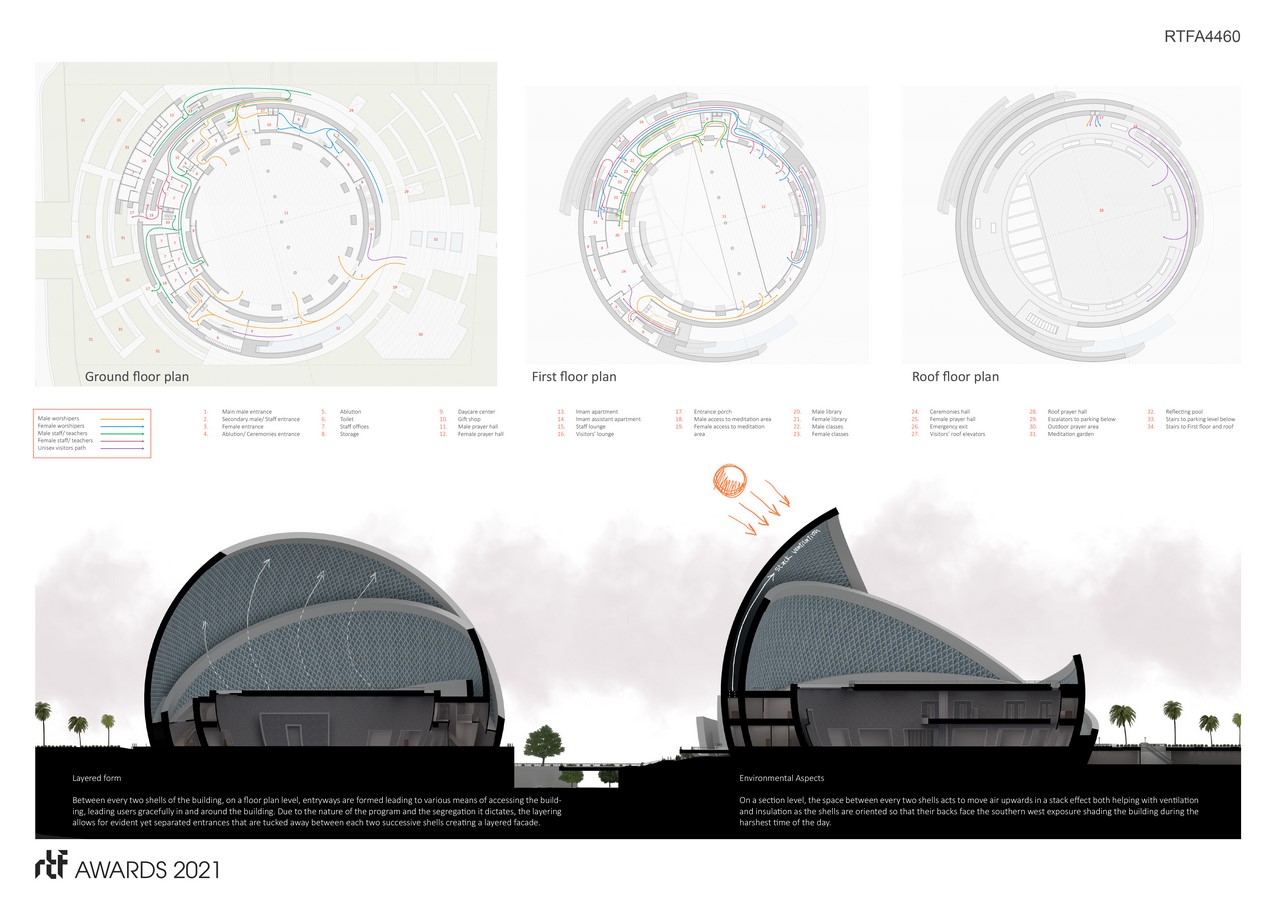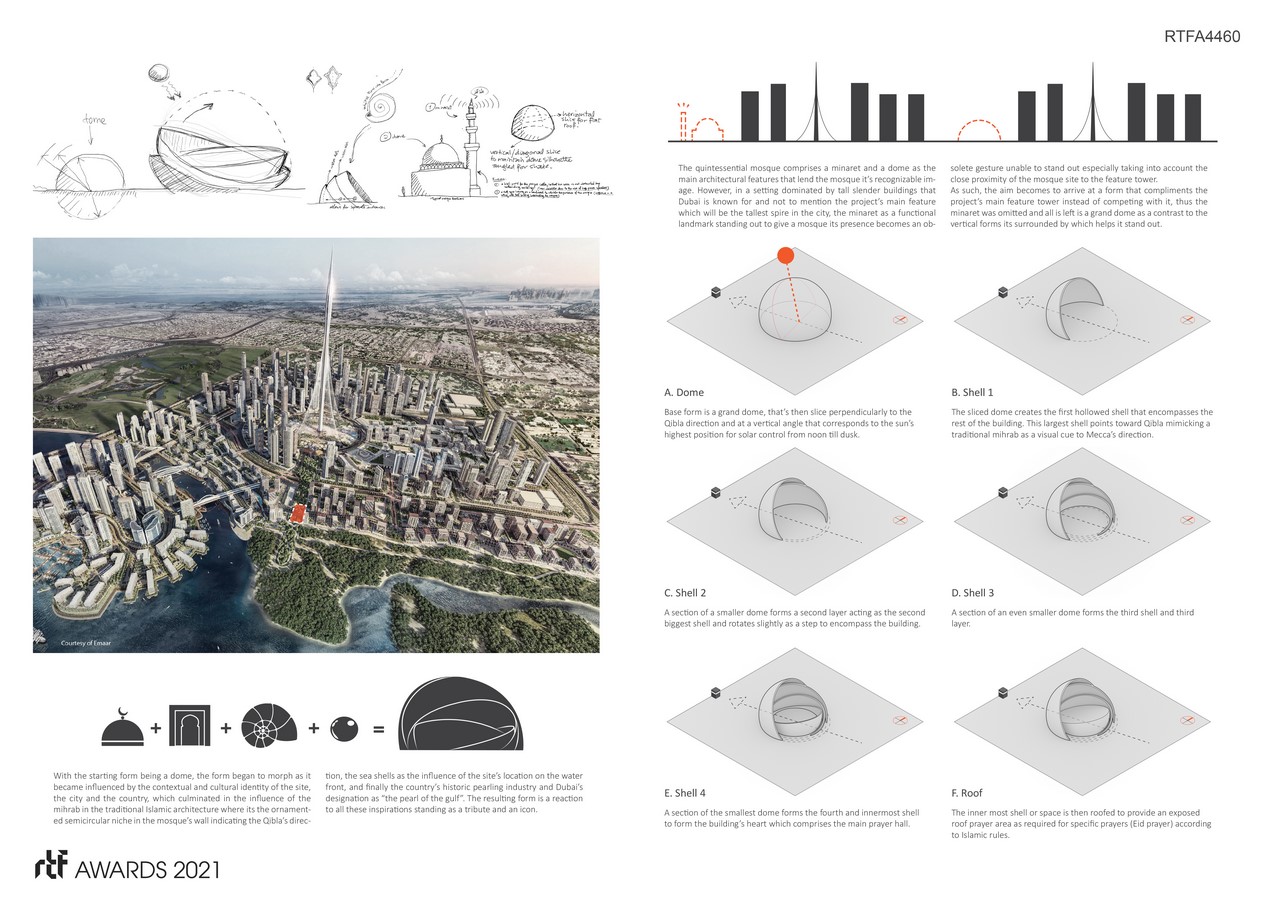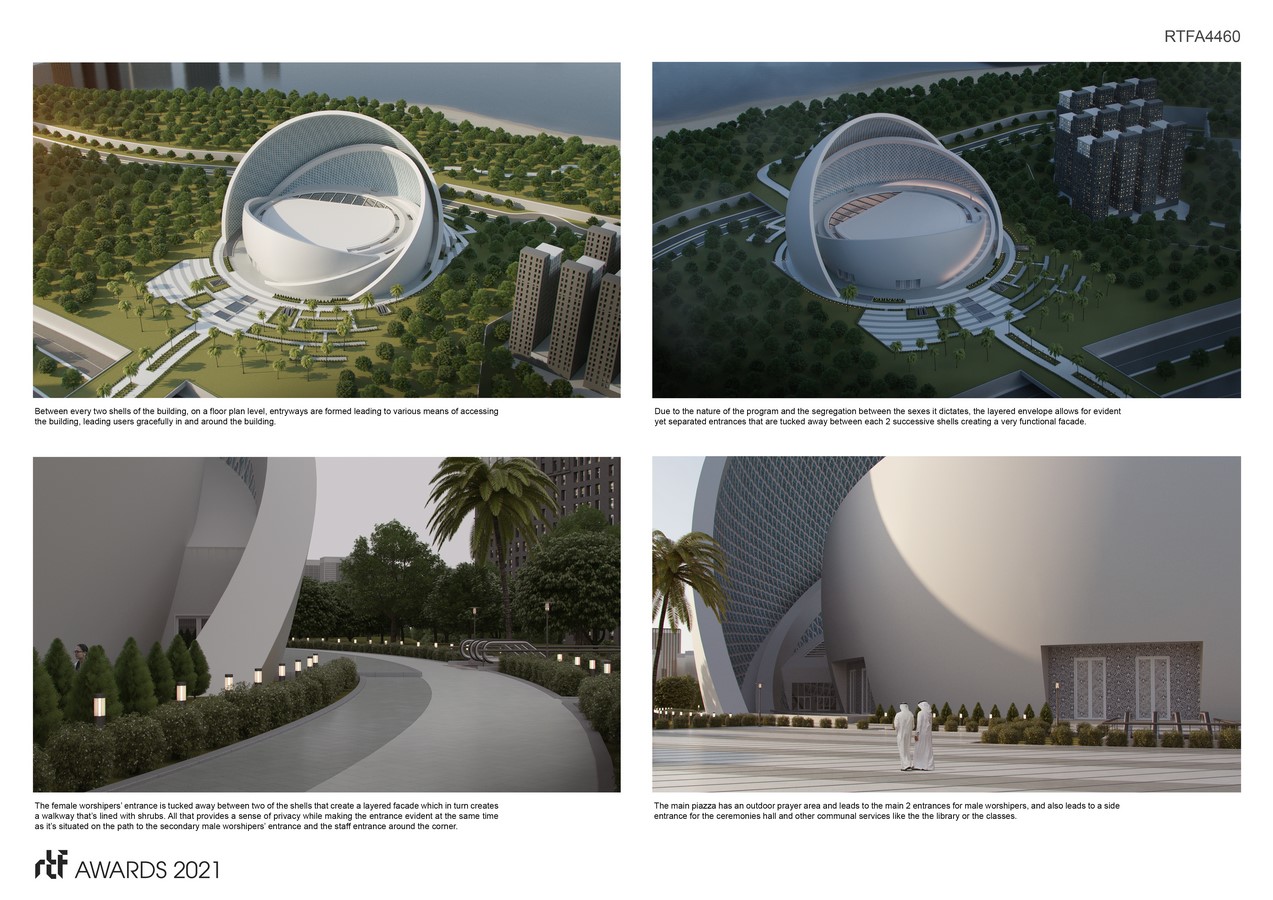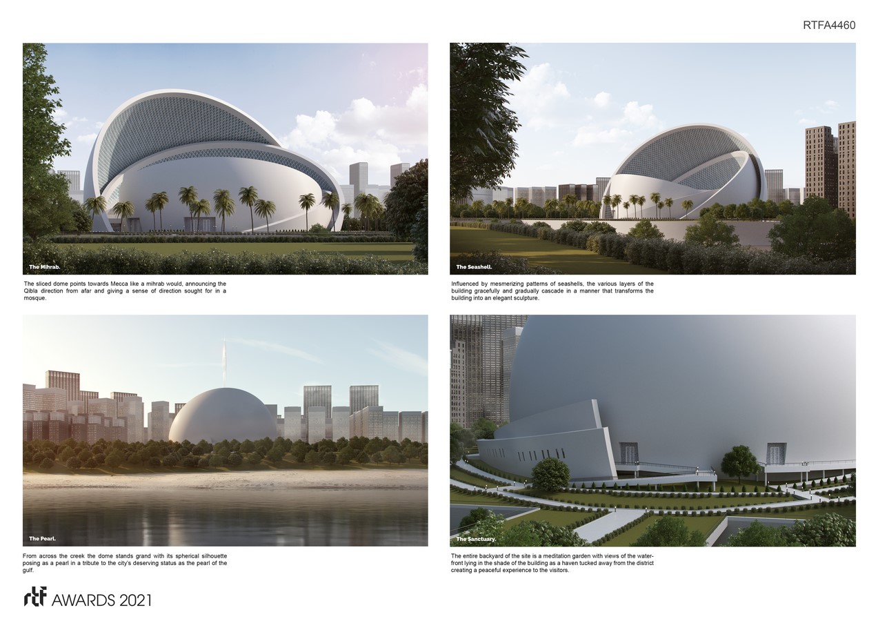 “Although the form isn’t of a typical mosque, it impeccably functions like one, satisfying the need for user segregation, directionality towards Mecca, and the most nuanced program requirements. Made up of layered shells, the largest one doubles as a dome typical in a mosque, also as a mihrab pointing towards Qibla, and a shield against thermal gain that shades the building. The resulting sculptural form will pose as a seashell, a pearl, or a monumental Mihrab all depending on the viewing angle while capturing the essence of Islamic architecture with its minimalist geometric character.”