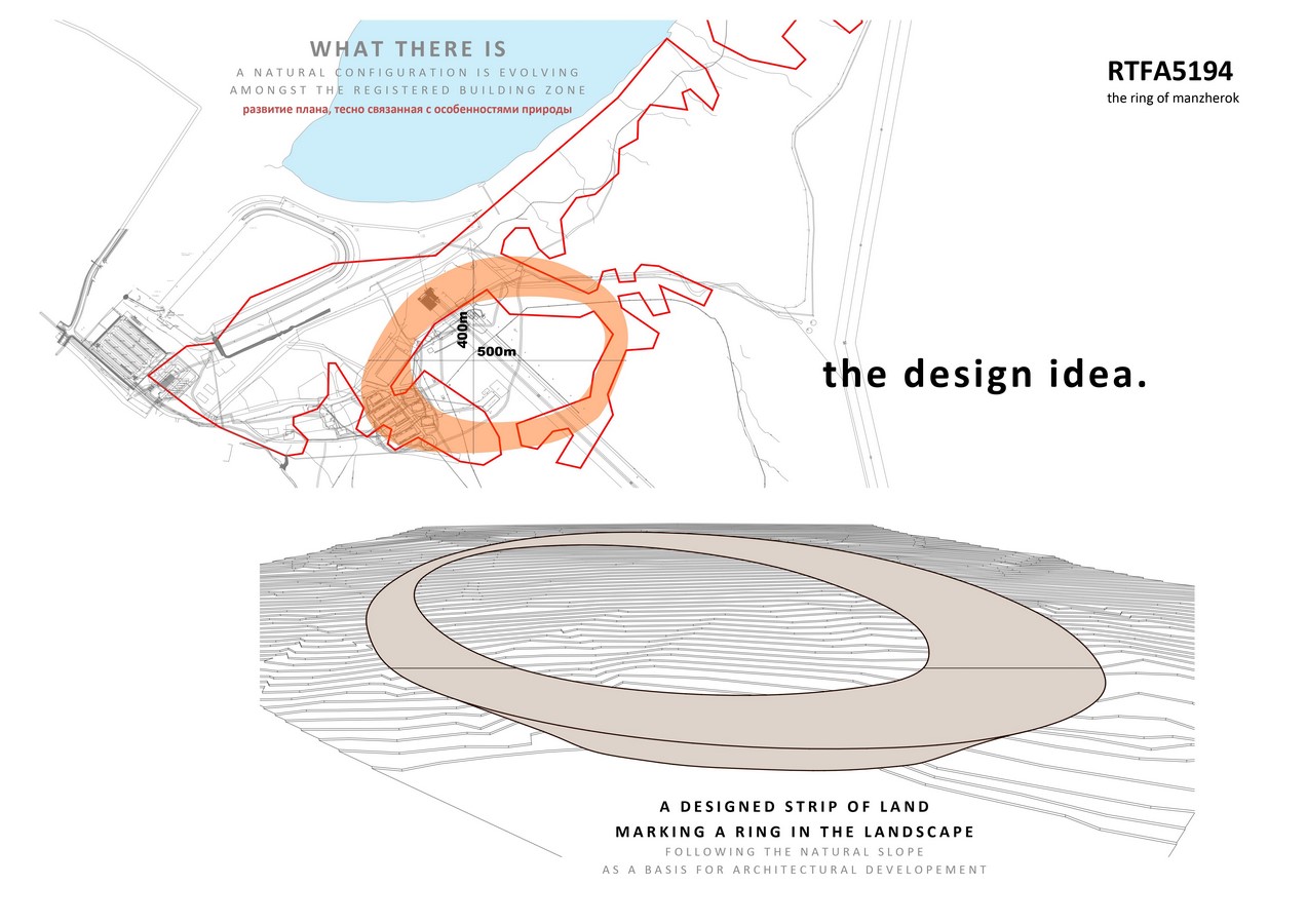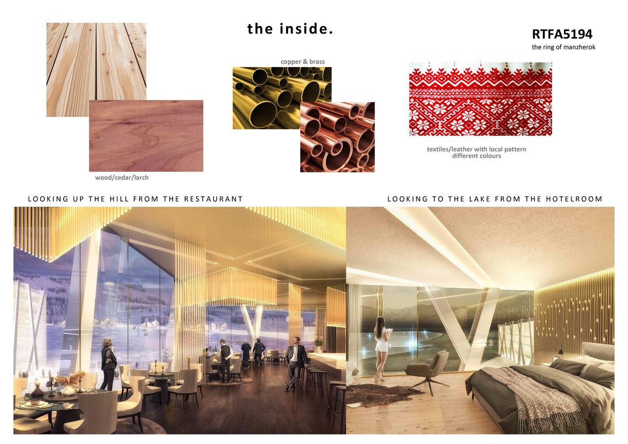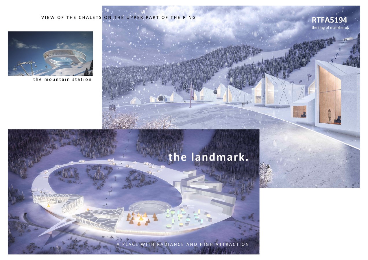 The building on the rings surface are configured in different zones. From the high activity zone (restaurants, shopping, gondola station, bigger hotel and apartment structures) to low activity zone (chalets with single or double occupation, welness and sauna huts etc) Through this configuration as a ring in the landscape – the landscape can be perceived from every point of the ring. As you look inside or outside the ring you are always right infront of the nature.