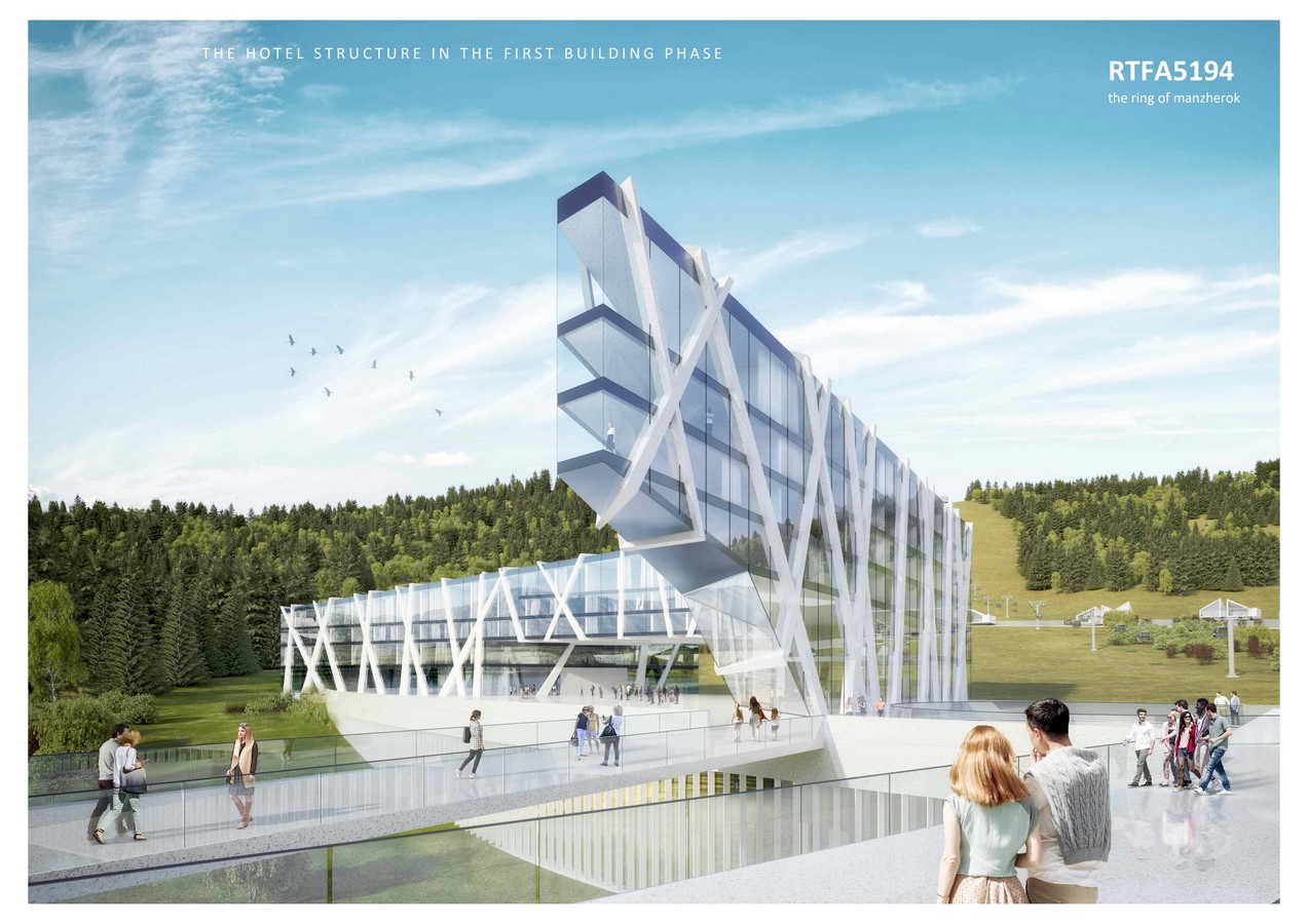 The building on the rings surface are configured in different zones. From the high activity zone (restaurants, shopping, gondola station, bigger hotel and apartment structures) to low activity zone (chalets with single or double occupation, welness and sauna huts etc) Through this configuration as a ring in the landscape – the landscape can be  perceived from every point of the ring. As you look inside or outside the ring you are always right infront of the nature.