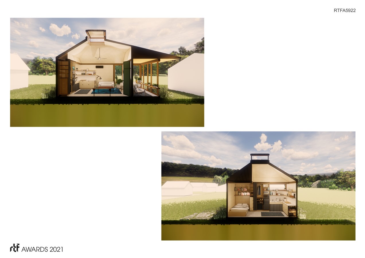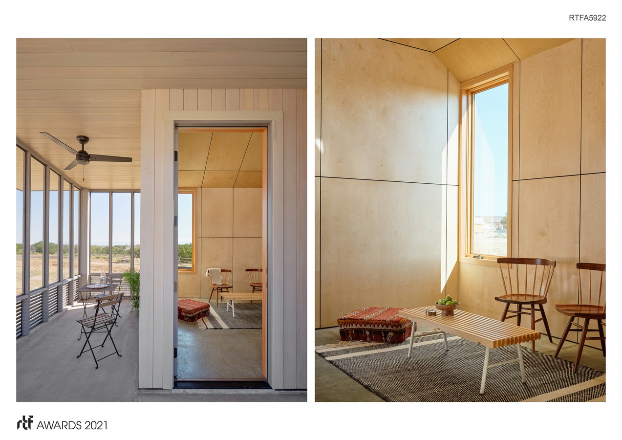 Our client for this project was a formerly homeless man currently living and working in the Community First! Village. Before finding the village, he was living on and off the streets while working at a call center. By working closely with the future resident and hearing about his lived experiences, our preconceived ideas of contemporary housing design were upended. For him, the feeling of home, comfort, and respite meant being wrapped within an armor-like enclosure, inward facing privacy far outweighing the importance of outward views, spatial expansion or even daylight.