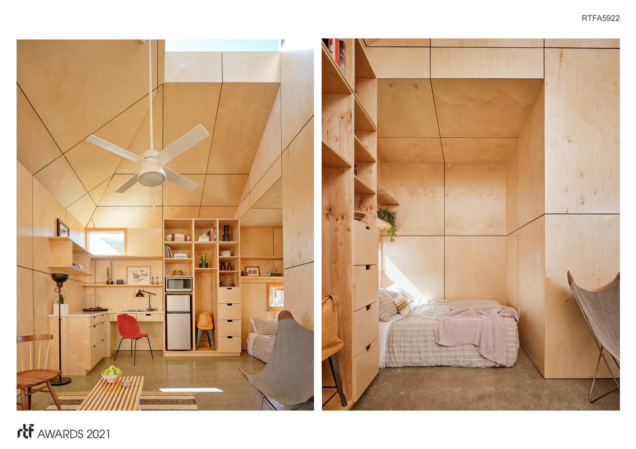 Given the minimal footprint, defining distinct living, eating, and sleeping zones while maintaining maximum open floor area became the primary organizing principle. A built-in storage wall accommodates necessities, fine-tuned to efficiently house clothes, shoes and toiletries together with pantry staples, cleaning tools and essential appliances. A built-in desk come utility counter doubles as a dining table. To further divide the space, the interior ceiling height is lowered dramatically within the sleeping zone – the size of a standard queen bed.