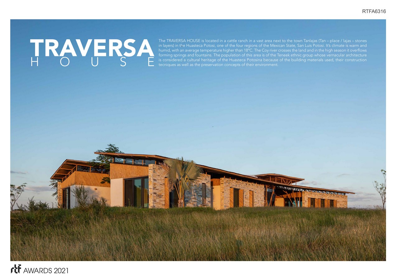 The TRAVERSA HOUSE is located in a cattle ranch in a vast area next to the town Tanlajas (Tan – place / lajas – stones in layers) in the Huasteca Potosi, one of the four regions of the Mexican State, San Luis Potosi. It’s climate is warm and humid, with an average temperature higher than 18ºC. The Coy river crosses the land and in the high season it overflows forming springs and fountains. The population of this area is of the Teneek ethnic group whose vernacular architecture is considered a cultural heritage of the Huasteca Potosina because of the building materials used, their construction tecniques as well as the preservation concepts of their environment.