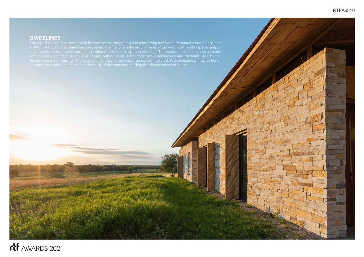 Conceived as a long narrow strip in the landscape, integrating and mimetizing itself with it’s natural surroundings, the TRAVERSA HOUSE has three main guidelines. The first one is the requirements of use which defines it’s type as temporary housing for the owners and friends when they visit and supervise the area. The second one is to achieve a spatial contemporary architecture, while using and putting in value the constructive techniques and materials used by the Teneek vernacular housing. At the same time it has to be in accordance with the studio’s architecture principles honoring the constructive éléments and the study of the context regarding the climate needs of the area.