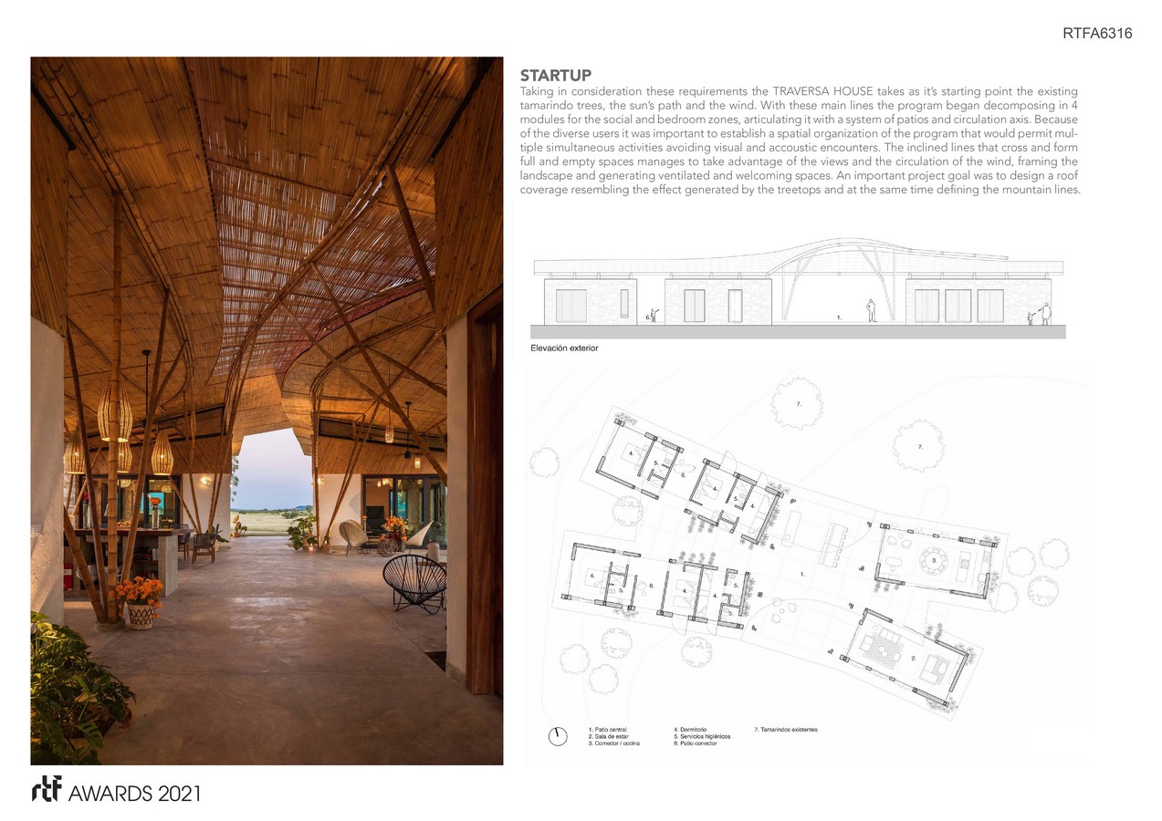 Taking in consideration these requirements the TRAVERSA HOUSE takes as it’s starting point the existing tamarindo trees, the sun’s path and the wind. With these main lines the program began decomposing in 4 modules for the social and bedroom zones, articulating it with a system of patios and circulation axis. Because of the diverse users it was important to establish a spatial organization of the program that would permit multiple simultaneous activities avoiding visual and accoustic encounters. The inclined lines that cross and form full and empty spaces manages to take advantage of the views and the circulation of the wind, framing the landscape and generating ventilated and welcoming spaces. An important project goal was to design a roof coverage resembling the effect generated by the treetops and at the same time defining the mountain lines.