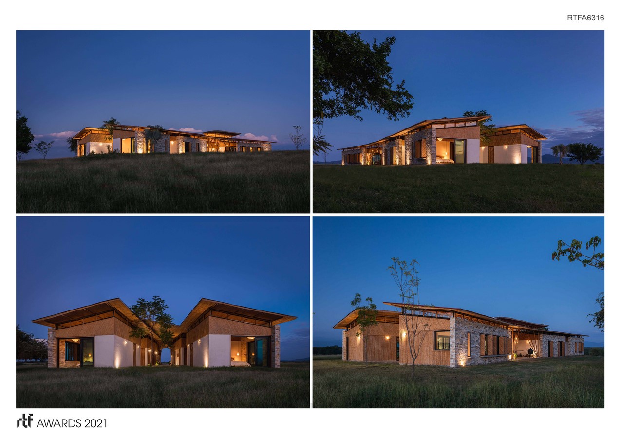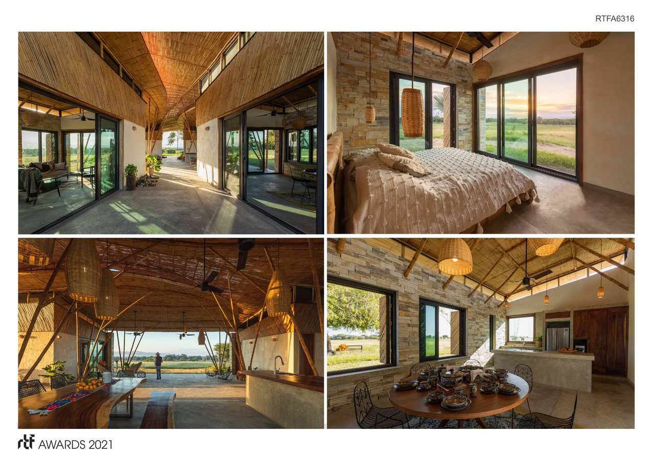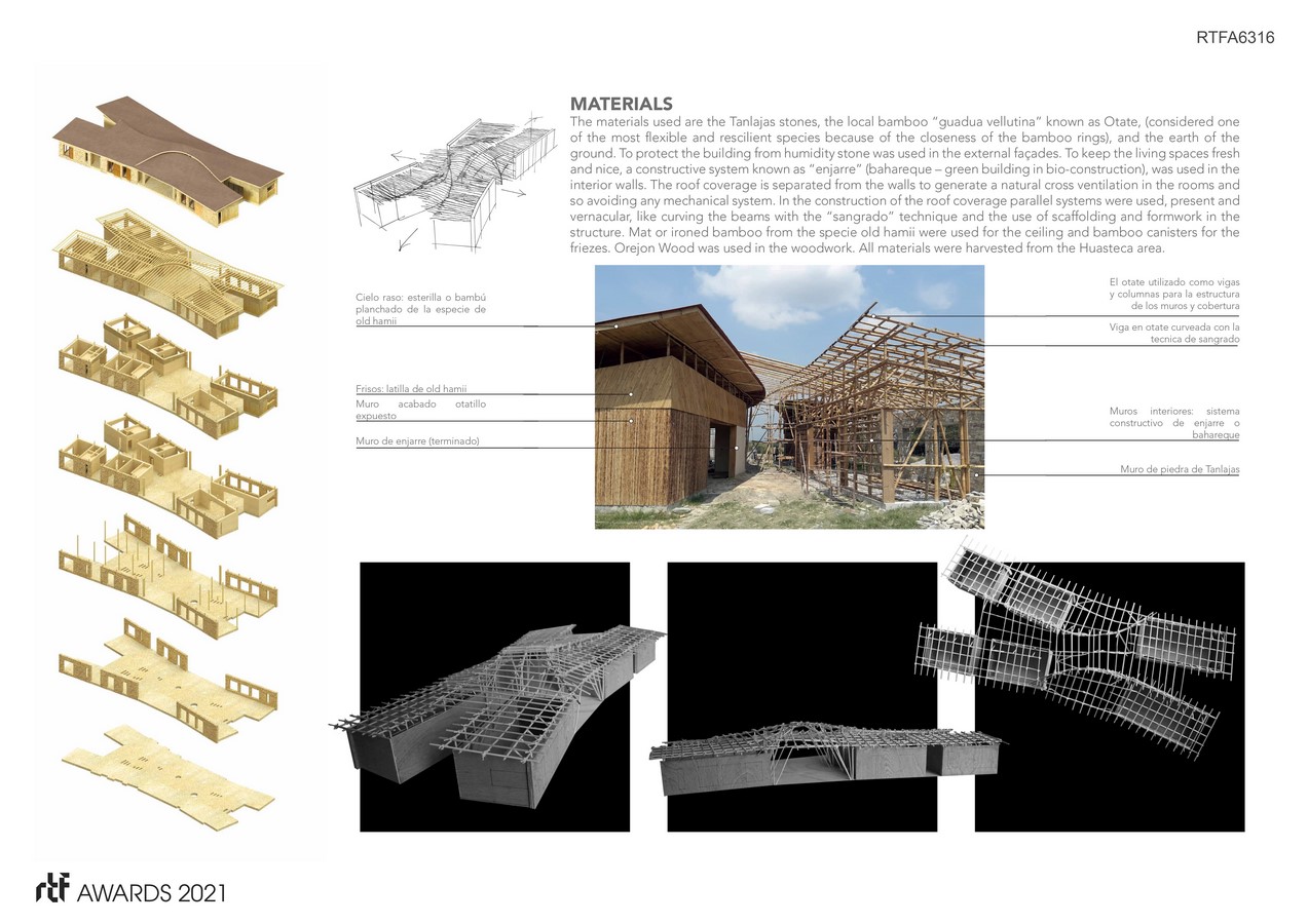 The materials used are the Tanlajas stones, the local bamboo “guadua vellutina” known as Otate, (considered one of the most flexible and rescilient species because of the closeness of the bamboo rings), and the earth of the ground. To protect the building from humidity stone was used in the external façades. To keep the living spaces fresh and nice, a constructive system known as “enjarre” (bahareque – green building in bio-construction), was used in the interior walls. The roof coverage is separated from the walls to generate a natural cross ventilation in the rooms and so avoiding any mechanical system. In the construction of the roof coverage parallel systems were used, present and vernacular, like curving the beams with the “sangrado” technique and the use of scaffolding and formwork in the structure. Mat or ironed bamboo from the specie old hamii were used for the ceiling and bamboo canisters for the friezes. Orejon Wood was used in the woodwork.