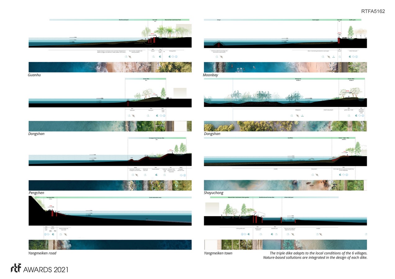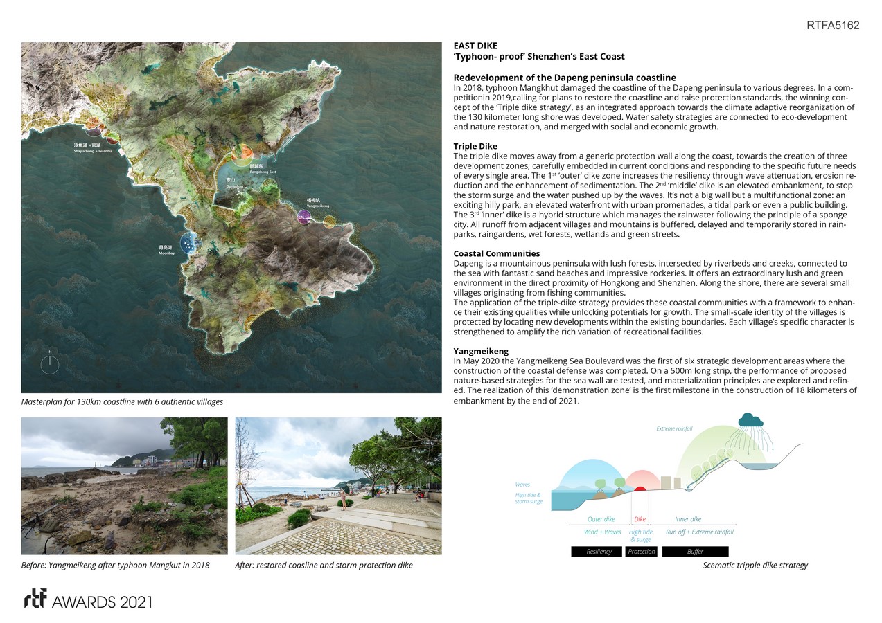 In 2018, typhoon Mangkhut damaged the coastline of the Dapeng peninsula to various degrees. In a competitionin 2019,calling for plans to restore the coastline and raise protection standards, the winning concept of the ‘Triple dike strategy’, as an integrated approach towards the climate adaptive reorganization of the 130 kilometer long shore was developed. Water safety strategies are connected to eco-development and nature restoration, and merged with social and economic growth.