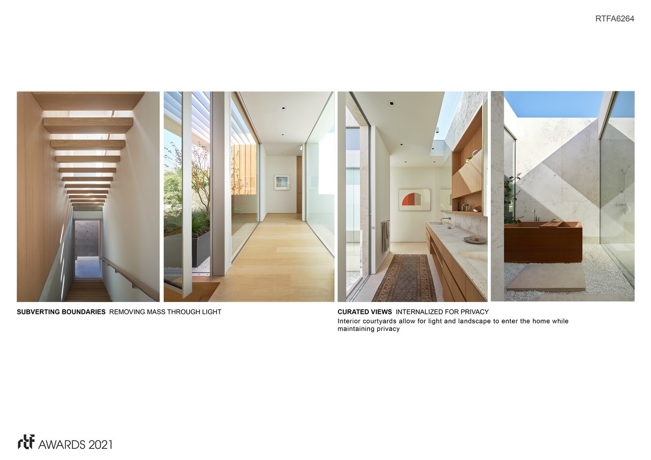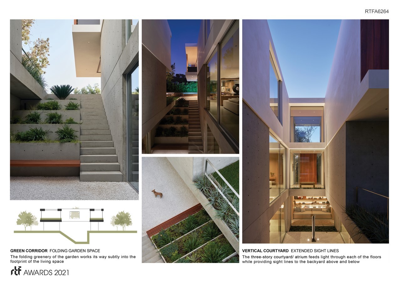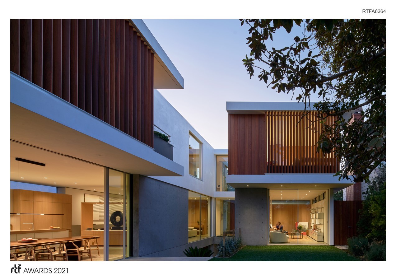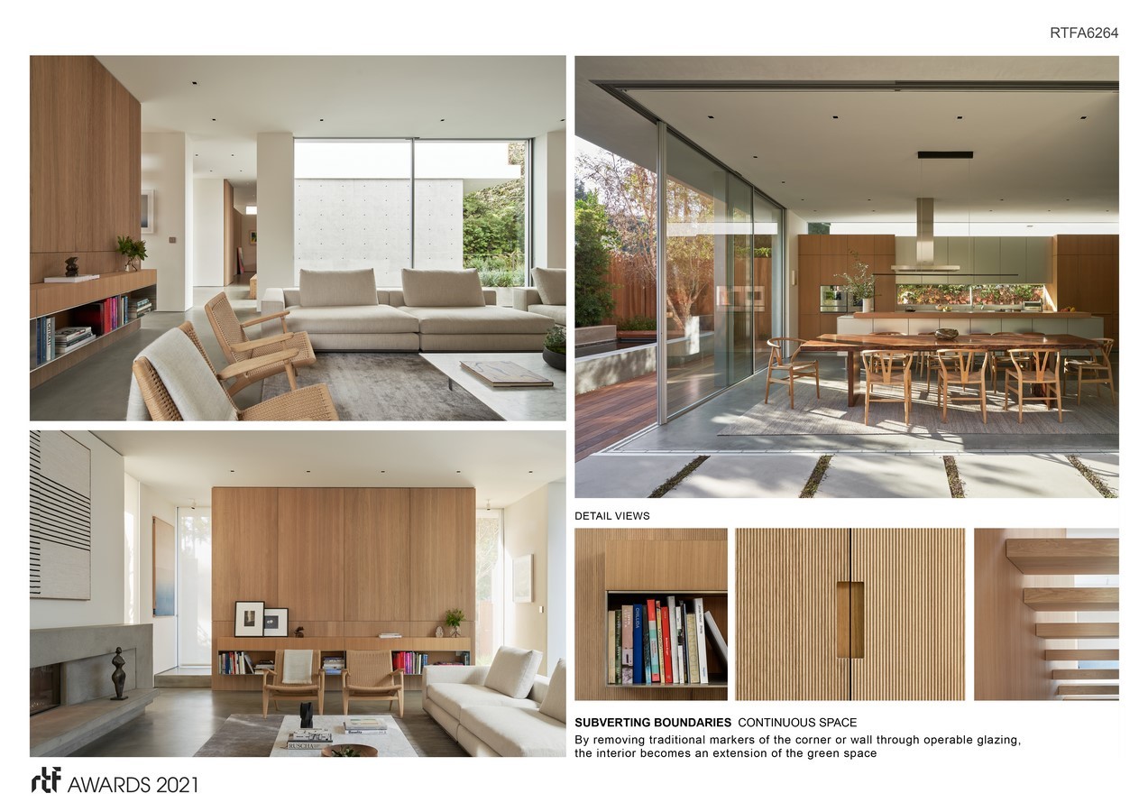 A folding garden feature sees the backyard greenery work its way subtly into the footprint of the living space. This relationship to the plot subverts the traditional notion of โboundaryโ by allowing the home to feel simultaneously protected and emergent of the site. Coupled with fully operable glazing and the aforementioned interstitial spaces, the home feels occupiable from anywhere on the lot.