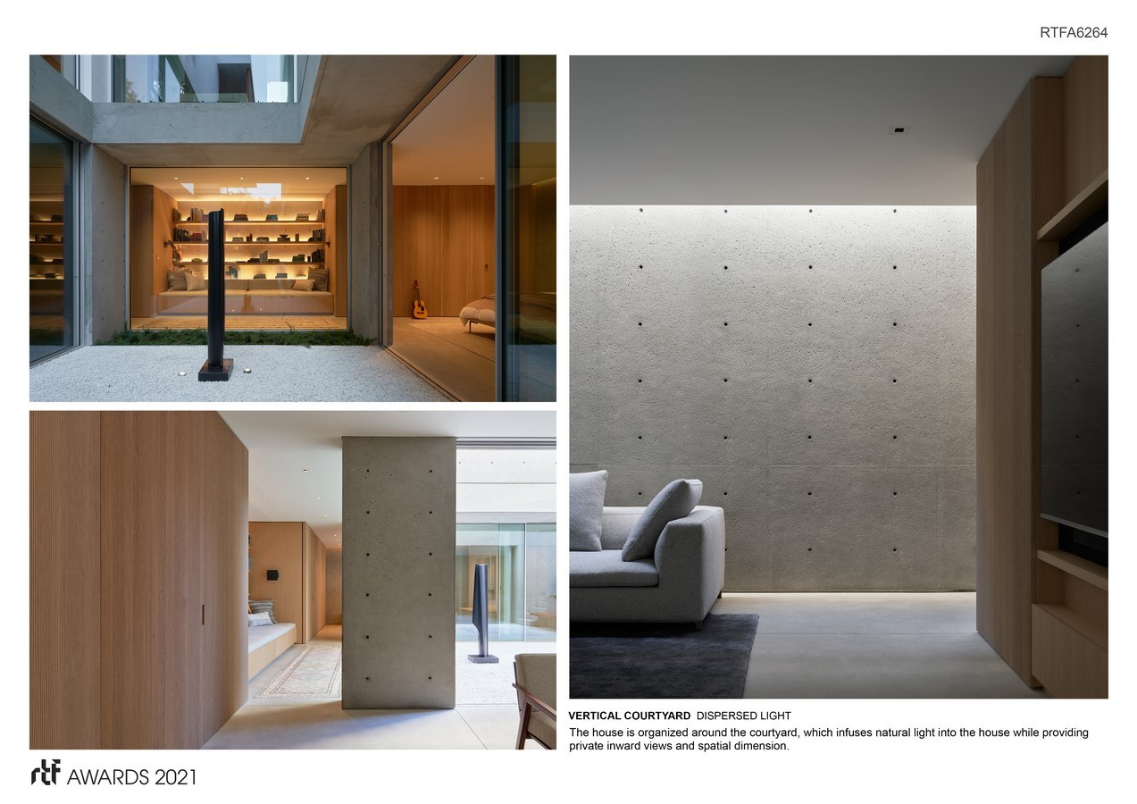Bookending the first floor is the basement complete with a guest suite, family room and walk-out patio, and the third floor featuring a library, two additional bedrooms, bathrooms and the master suite. Integrated planters and a private deck extend the master bedroom, lending a view of the linear pool and reconnecting to the greenspace below. A bridge continues the core circulation from the library across to the secondary mass of the house, providing close proximity for family members while maintaining privacy. The three-story courtyard/atrium feeds light through each of the floors, including the basement, while providing sightlines to the backyard, as well as above and below.