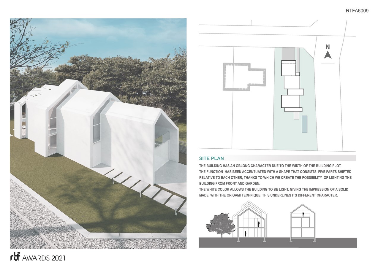 The function of the building has been accentuated with a body that consists of five parts shifted relative to each other, thanks to which we create the possibility of lighting the building front and garden. The white color allows the building to be light, giving the impression of a solid made with the ORIGAMI technique. This underlines its different character.
