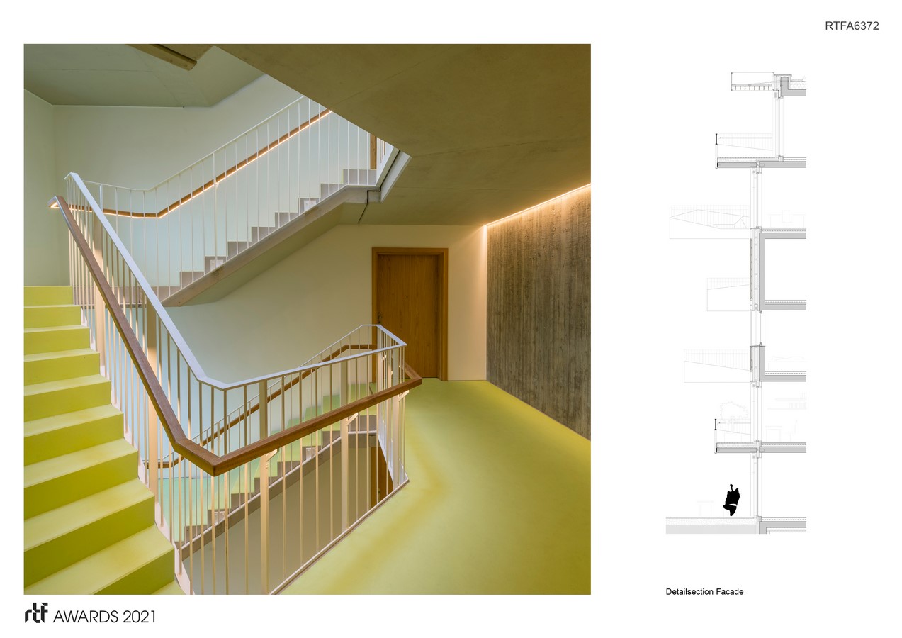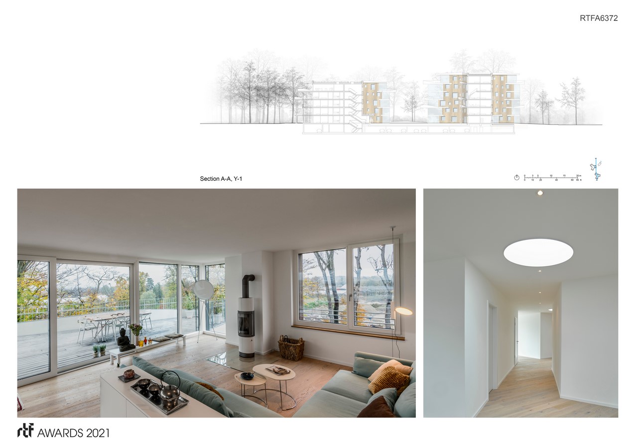 The facades are notable for the striking horizontal bands of the balcony parapets with their open, glazed sections, which alternate with the closed parts of the wooden frontage. This is articulated through freely arranged, square timber-framed windows of different sizes, while the staggered arrangement of the differently angled white parapets of the projecting balconies and terraces gives the buildings a dynamic appearance. The materials, colors, and feel of the special environment are reflected in the perforated facade with its rough-cut, pre-grayed wooden paneling in various earthy brown and silver tones. In the interior, the warm green-and-yellow leaf tones contrast with oak wood, exposed concrete, white plaster and steel railings.