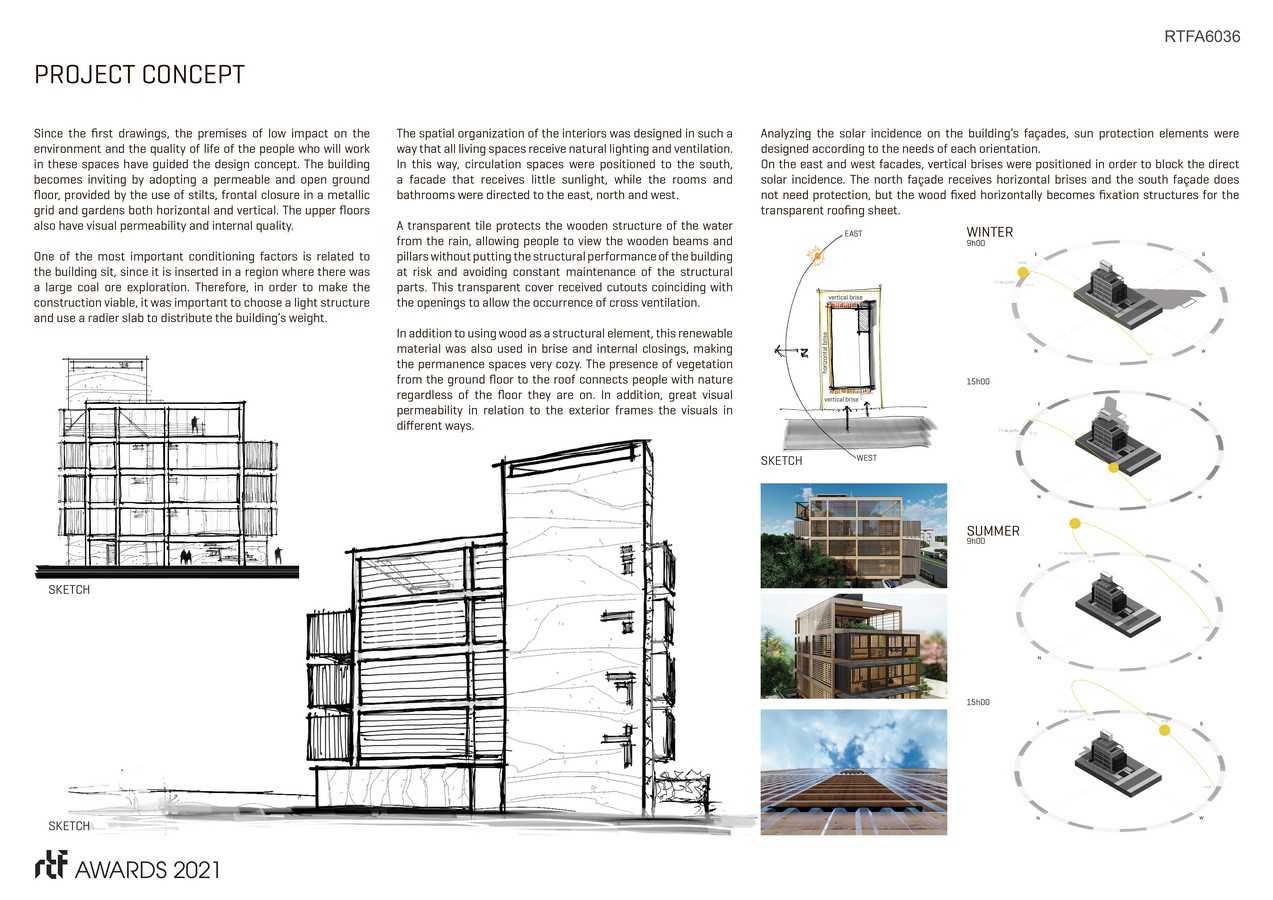 Since the first drawings, the premises of low impact on the environment and the quality of life of the people who will work in these spaces have guided the design concept. The building becomes inviting by adopting a permeable and open ground floor, provided by the use of stilts, frontal closure in a metallic grid and gardens both horizontal and vertical. The upper floors also have visual permeability and internal quality.