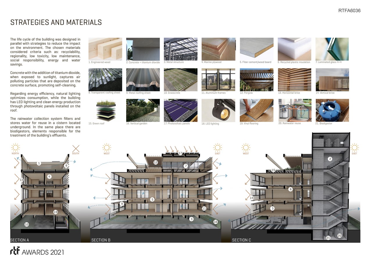 The life cycle of the building was designed in parallel with strategies to reduce the impact on the environment. The chosen materials considered criteria such as: recyclability, regionality, low toxicity, low maintenance, social responsibility, energy and water savings.