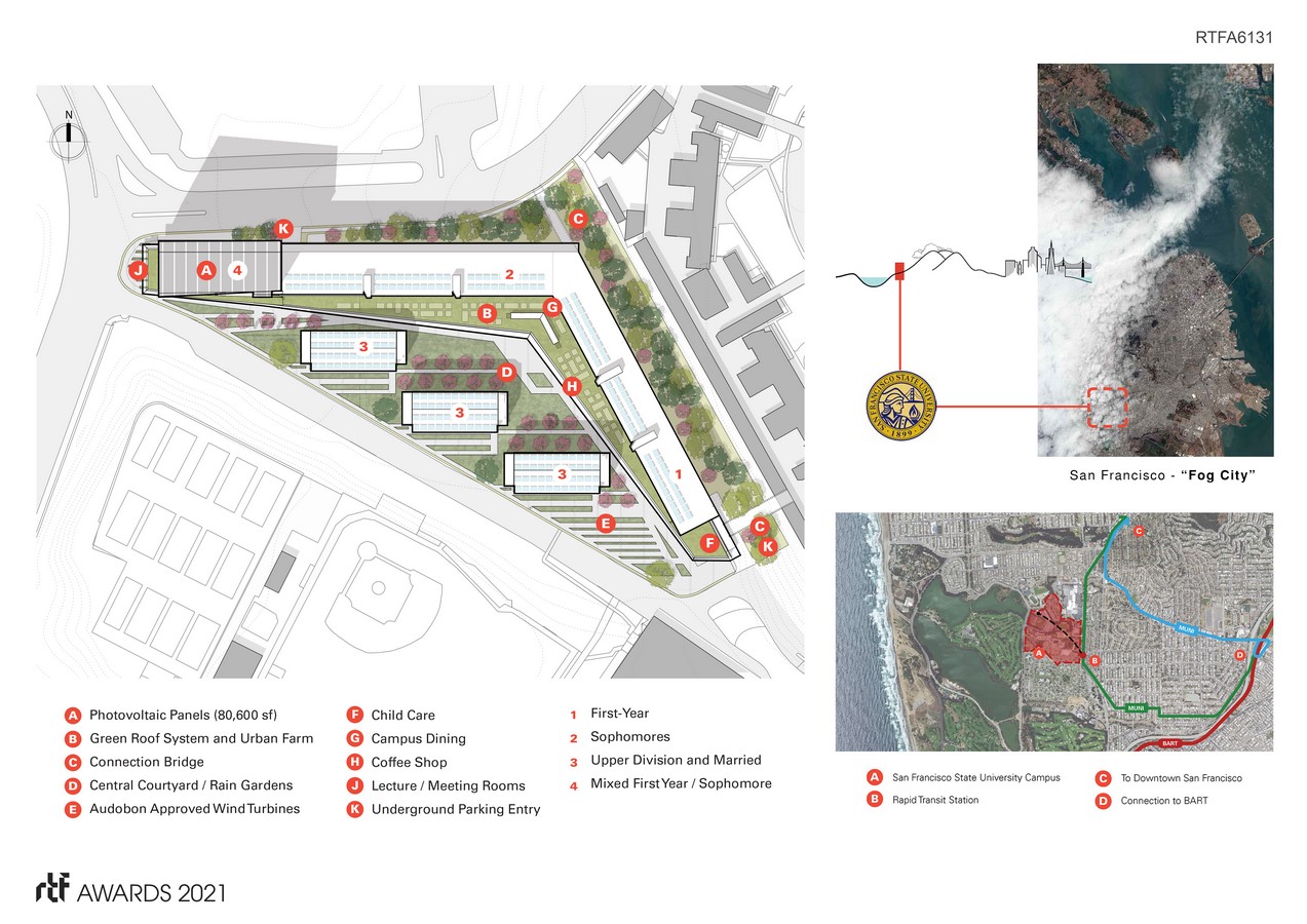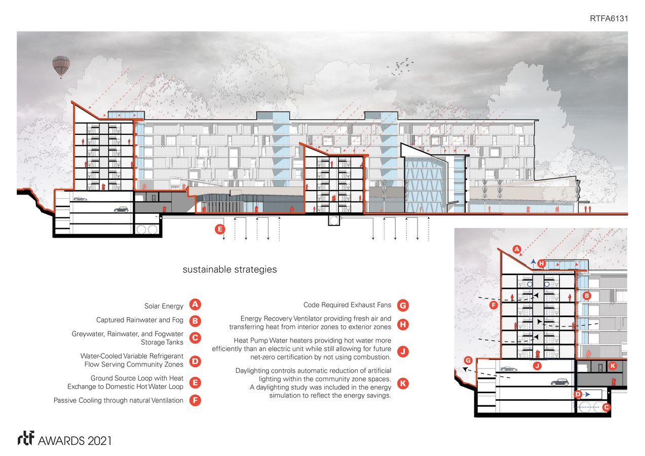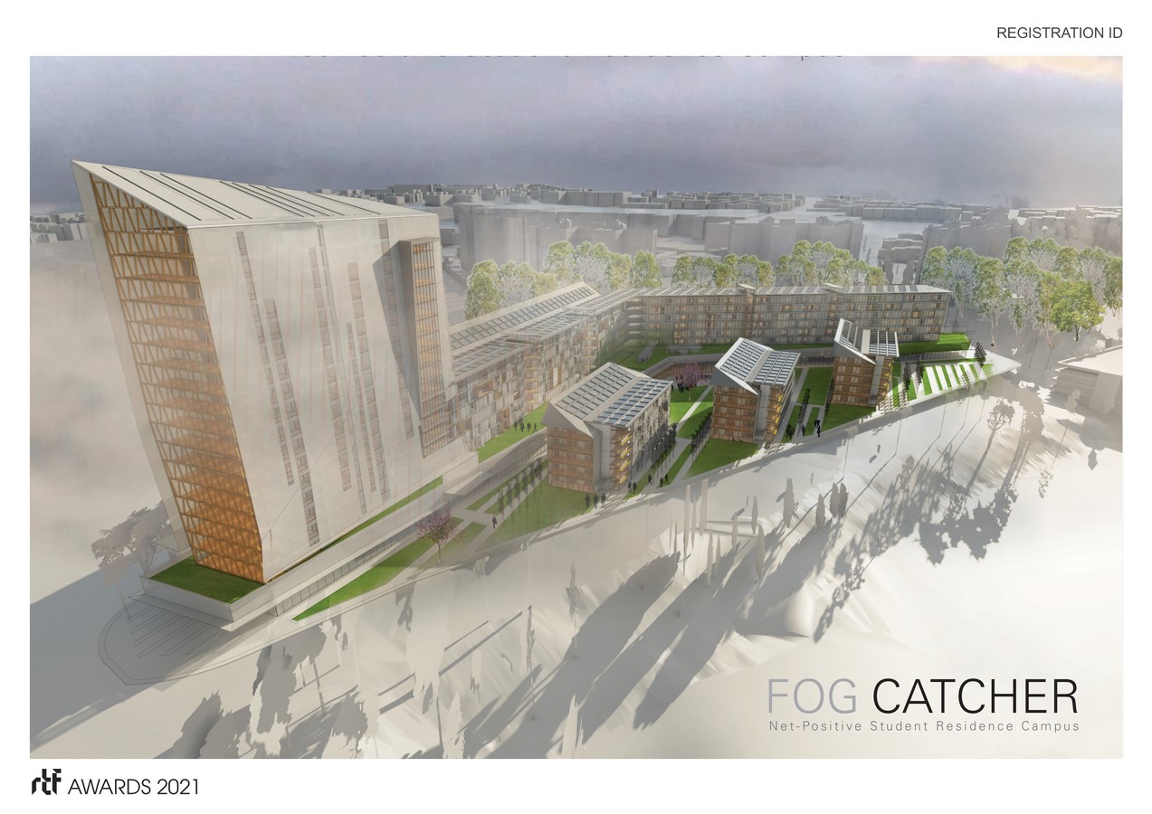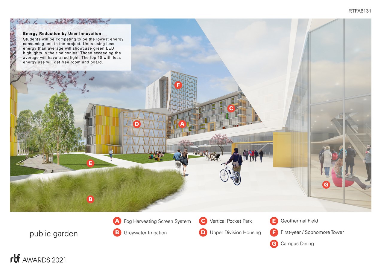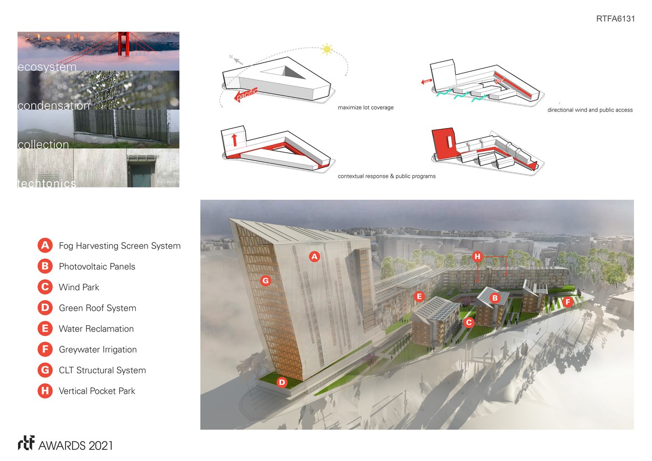 The building is enveloped in a “cloud-like” metallic shroud expressive of the natural breezes that enfold the student housing buildings like a perforated, filmy blanket. Addressing California’s continued struggles with droughts, the design follows biomimicry. Similar to homeohydrous desert plants that collect dew, the design highlights a transparent mesh ‘shroud’ that collects fog condensation acting as a fog-catcher and gathering enough water from the ambient fog to provide sufficient water for each student annually, while providing customizable sun shading devices. The cloud-like fog catcher has operable shutters that can be opened or closed depending on the privacy desired or the controllability of sunlight and glare.