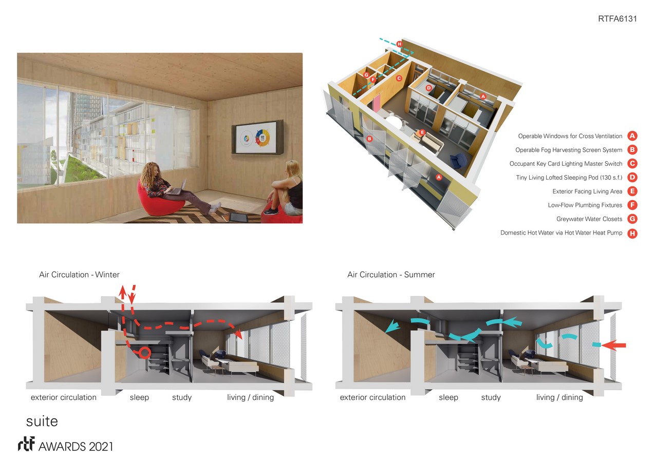 The design utilizes a tight and well-insulated building envelope and incorporates a “flipped” tiny living housing concept with smaller internal sleeping quarters, which supports student’s demand for more privacy while providing general communal living spaces along the perimeter which meets desires for more daylight and overall wellness in a campus living experience.