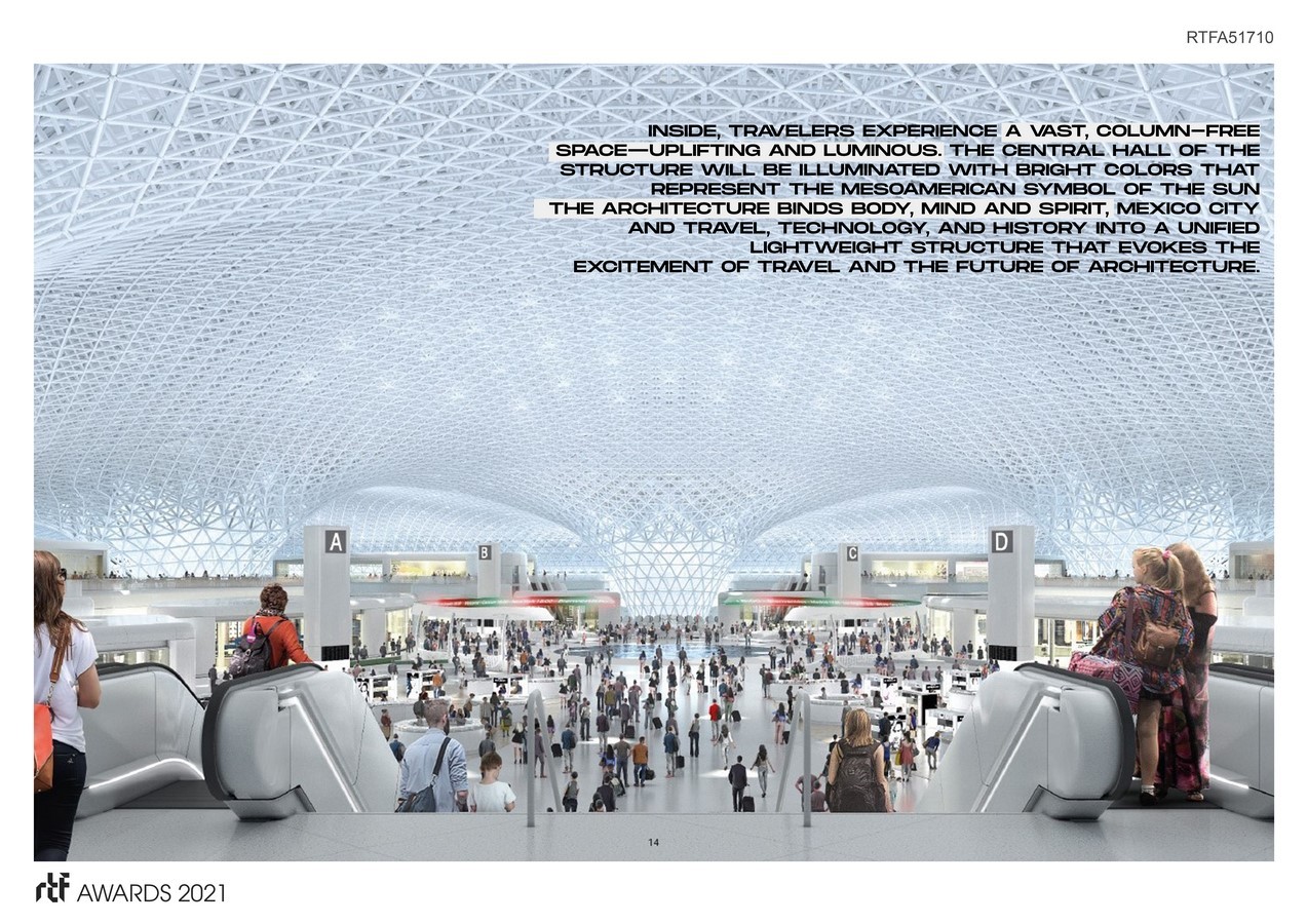 The intense colors, characteristic of Mexican culture, bleed into the functional components of the intelligent membrane skin/building facade. The Mesoamerican symbol of the sun is evoked within the central luminous vaulted hall. From the initial view from the sky and the car, to the awe-inspiring moment of making it inside, the architecture binds body and spirit, Mexico City and travel, technology and history, into a unified lightweight structure that evokes the excitement of traveling.