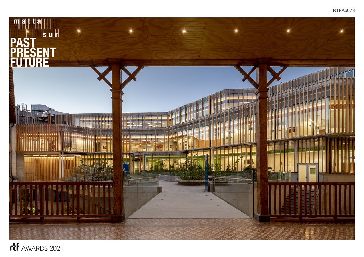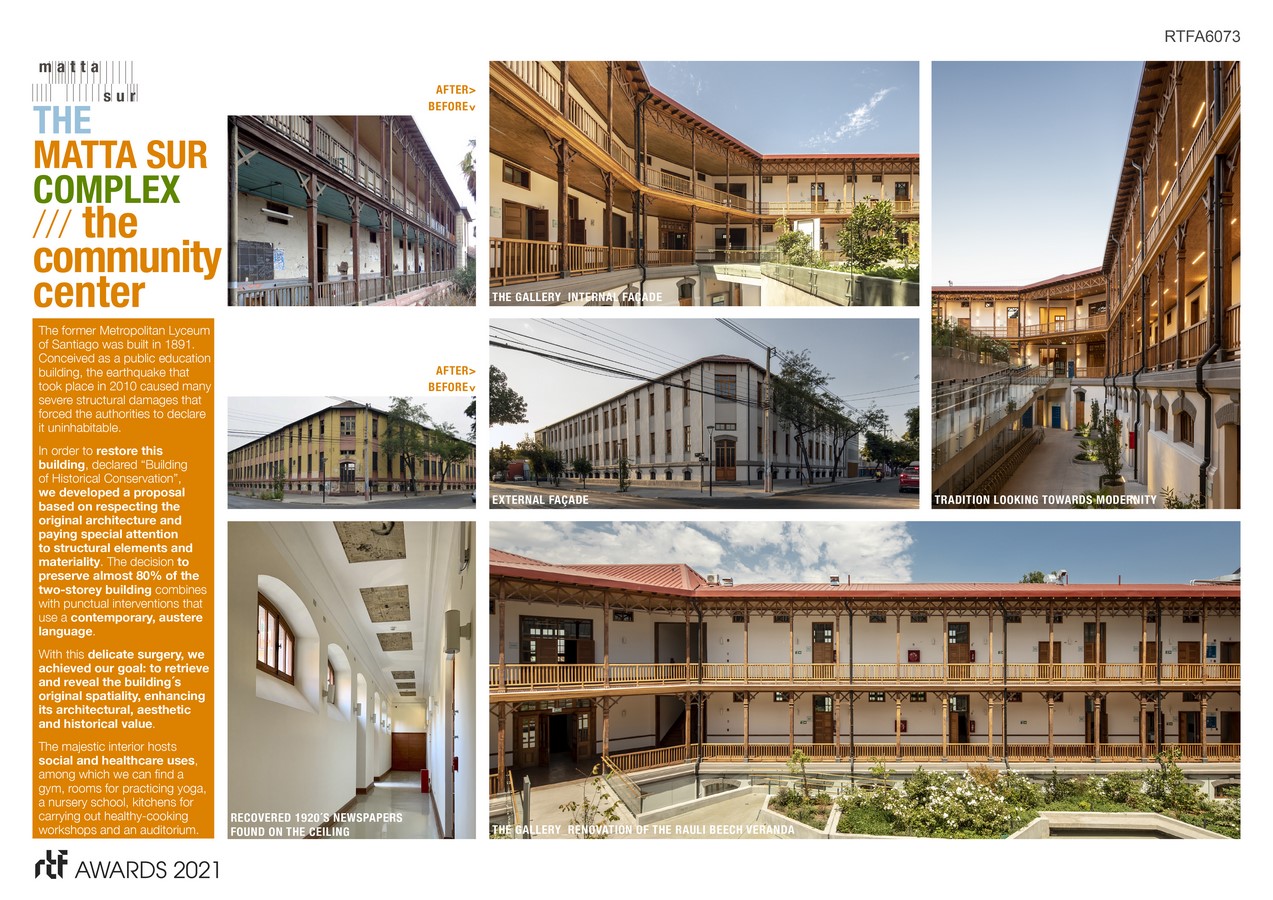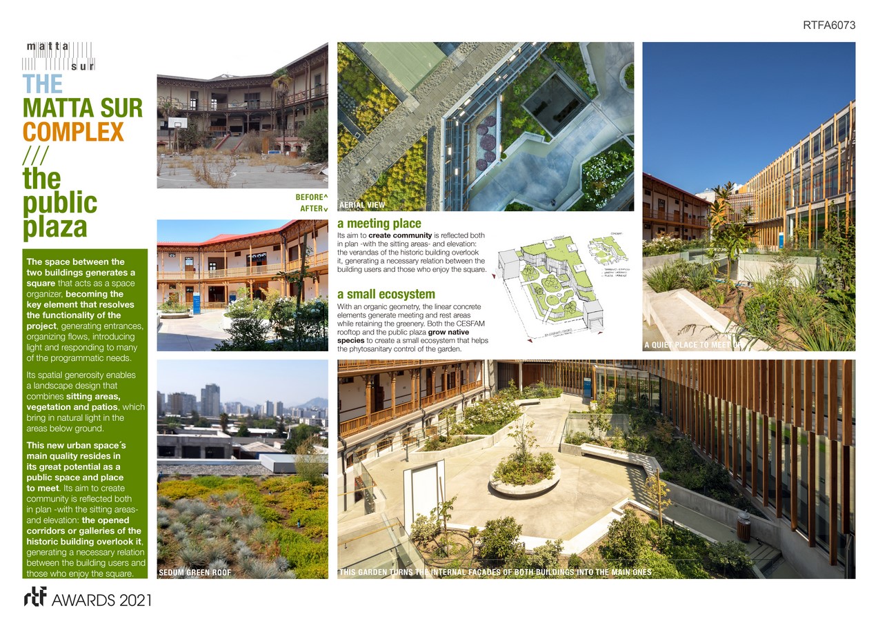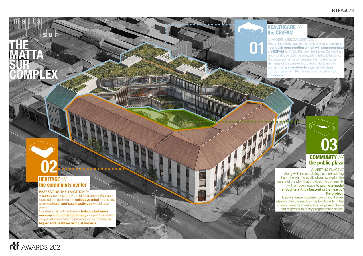 The Matta Sur Complex consists of two buildings located within the same plot: the former Metropolitan Lyceum of Santiago, built in 1891, and restored to host social uses such as a nursery school, a gym or an auditorium; and a new-build construction which will accommodate a CESFAM (a Public Primary Healthcare Center). Both buildings have a total built area of 5,500 m2 that will give support to a community of more than 30,000 users. Along with these buildings and articulating them, there’s the public plaza, located in the center of the plot, that provides the community with an open space to promote social encounters, thus becoming the heart of the project.