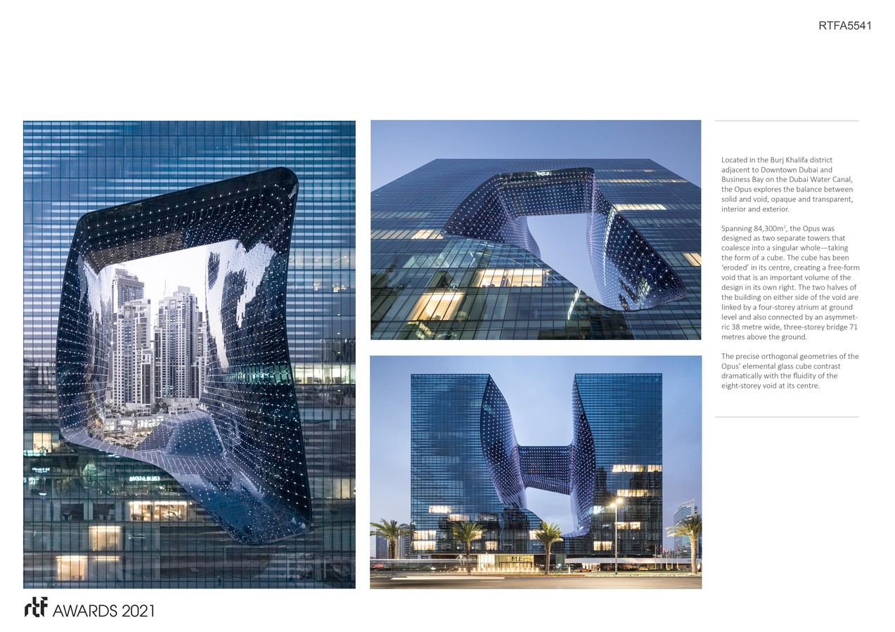 Located in the Burj Khalifa district adjacent to Downtown Dubai and Business Bay on the Dubai Water Canal, the Opus explores the balance between solid and void, opaque and transparent, interior and exterior. Spanning 84,300m2, the Opus was designed as two separate towers that coalesce into a singular whole—taking the form of a cube. The cube has been ‘eroded’ in its centre, creating a free-form void that is an important volume of the design in its own right. The two halves of the building on either side of the void are linked by a four-storey atrium at ground level and also connected by an asymmetric 38 metre wide, three-storey bridge 71 metres above the ground.