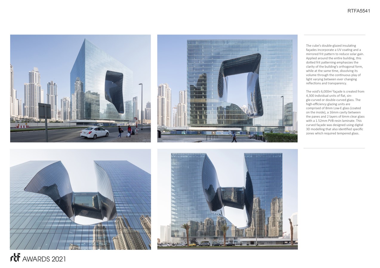 The void’s 6,000m2 façade is created from 4,300 individual units of flat, single-curved or double-curved glass. The high-efficiency glazing units are comprised of 8mm Low-E glass (coated on the inside), a 16mm cavity between the panes and 2 layers of 6mm clear glass with a 1.52mm PVB resin laminate. This curved façade was designed using digital 3D modelling that also identified specific zones which required tempered glass.