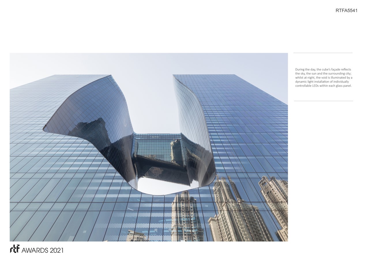 During the day, the cube’s façade reflects the sky, the sun and the surrounding city; whilst at night, the void is illuminated by a dynamic light installation of individually controllable LEDs within each glass panel.