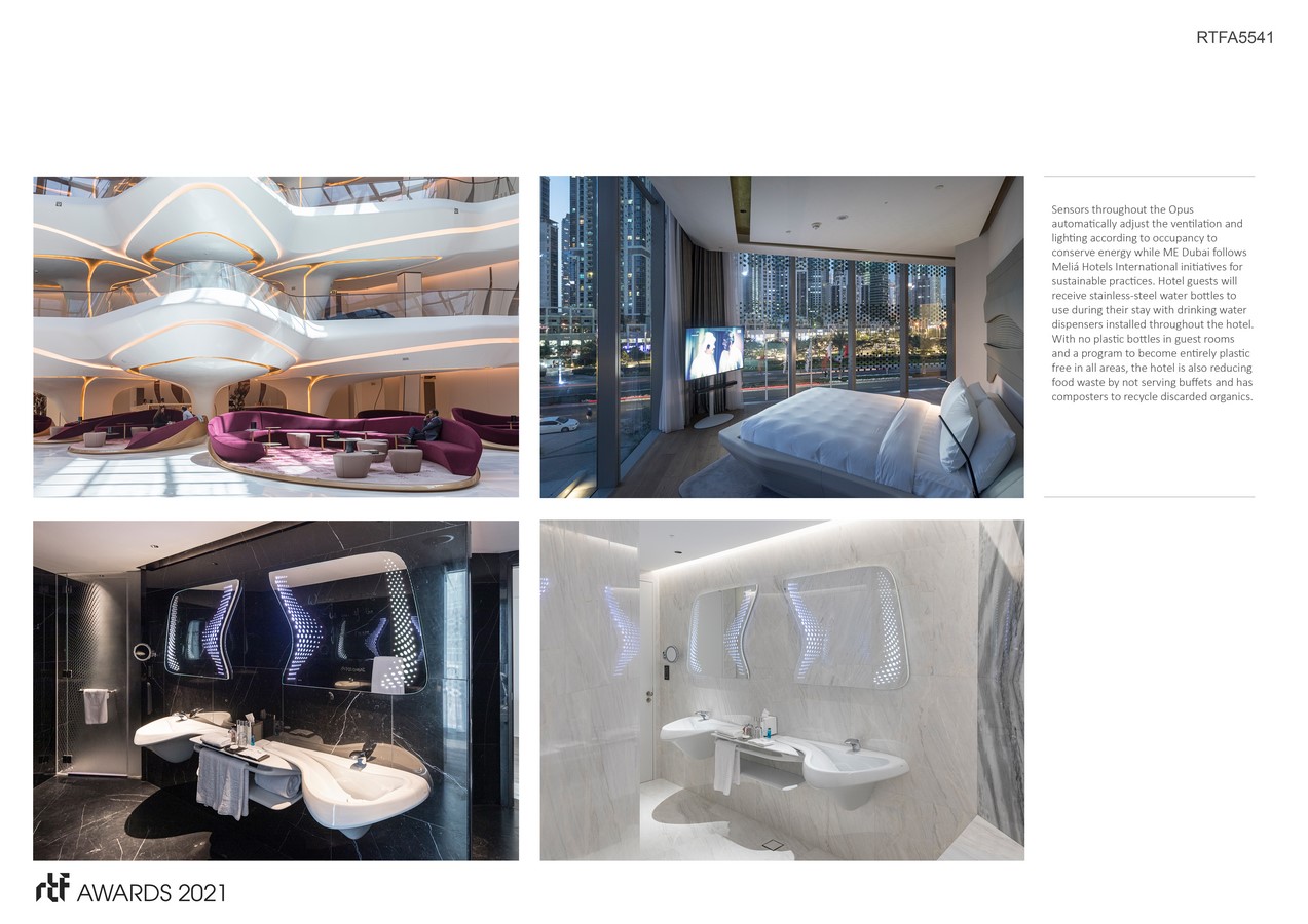 Sensors throughout the Opus automatically adjust the ventilation and lighting according to occupancy to conserve energy while ME Dubai follows Meliá Hotels International initiatives for sustainable practices. Hotel guests will receive stainless-steel water bottles to use during their stay with drinking water dispensers installed throughout the hotel. With no plastic bottles in guest rooms and a program to become entirely plastic free in all areas, the hotel is also reducing food waste by not serving buffets and has composters to recycle discarded organics.