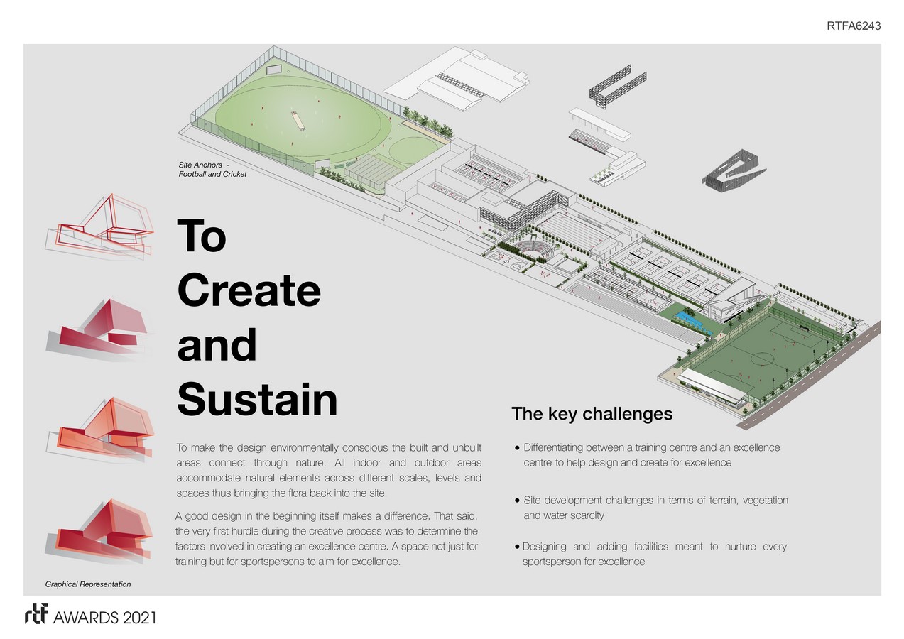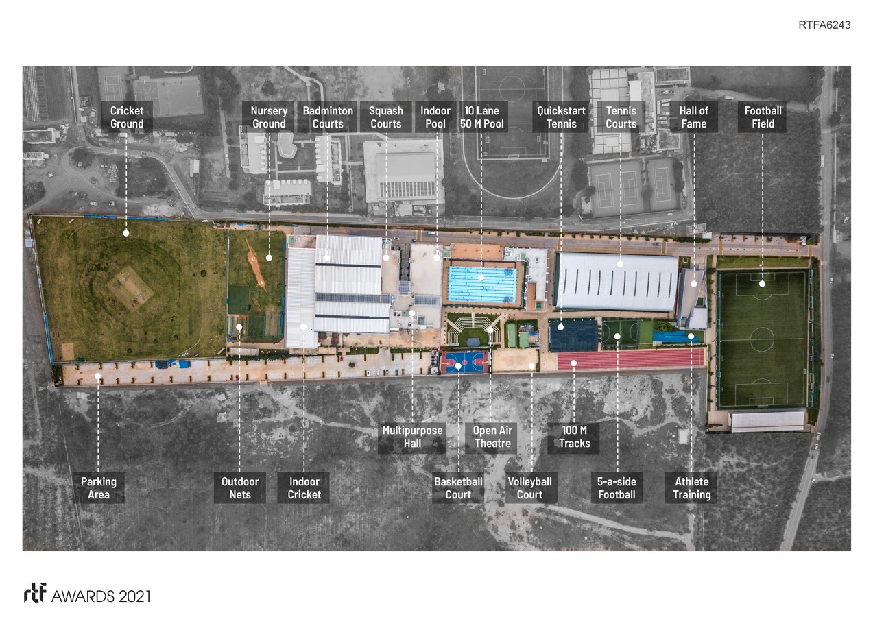 Since the site was linear and outdoor sports had to be oriented in North-South direction, the central pedestrian spine anchors the project allowing for chance encounters with the sports legends, thus facilitating interdisciplinary learning. In many ways, the central spine behaves like a thread and bead, with the spine as the thread and various sports as the beads along the way.