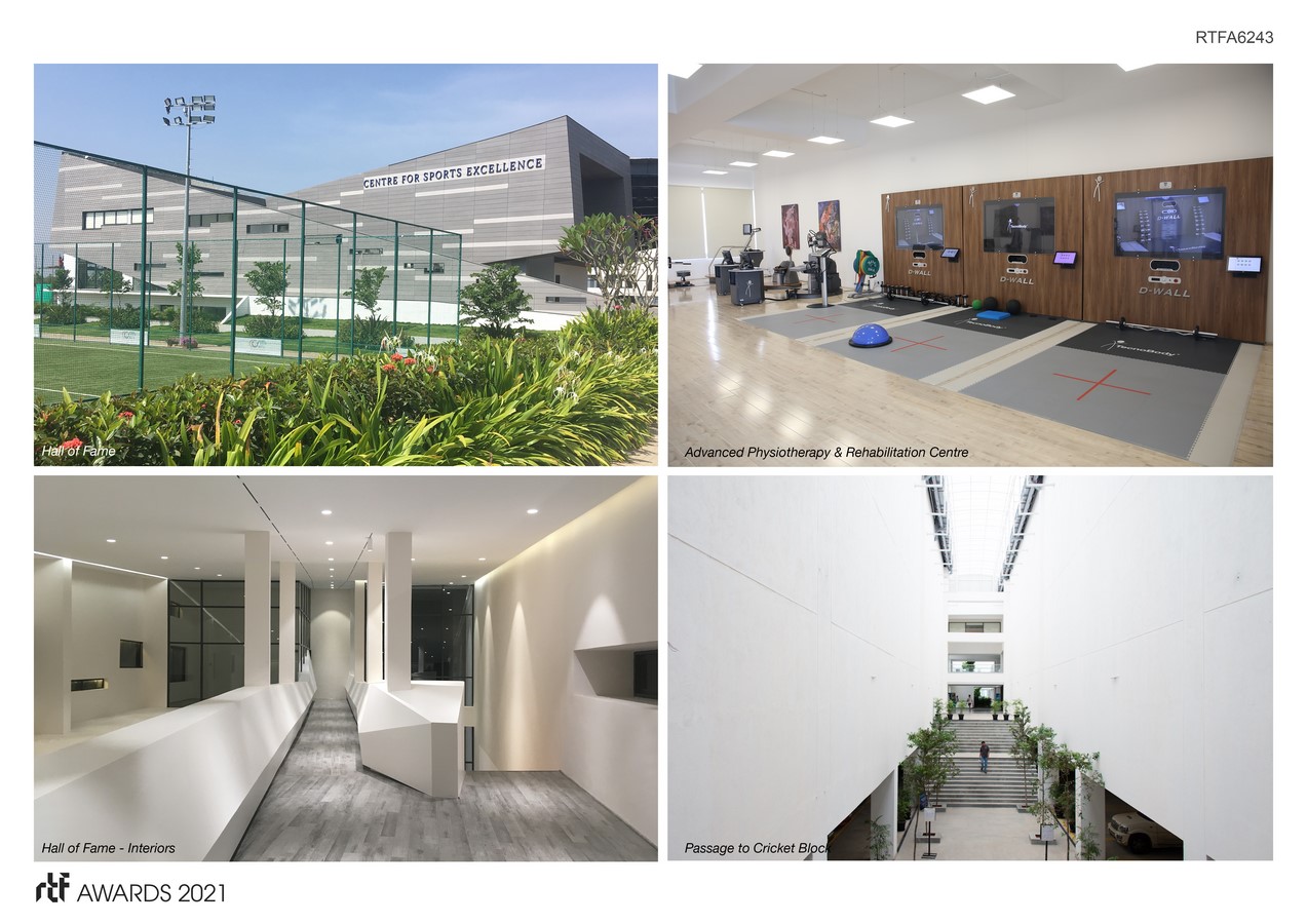 The Hall of Fame, which is the marquee building in the campus was set in the master plan in a manner that it had ample foreground across the football pitch, which in more than one way is the ‘genus loci’ of the campus. The architecture language took birth from the idea of infinity and the infinite possibilities of achieving sports excellence. This building houses displays and narratives of India’s sporting success and Indian sportsmen who have excelled in their sports discipline.