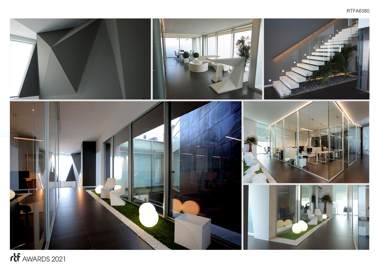 For the design of the Offices, a double height entrance has been proposed with a broken wall on the staircase of flown steps, generating a sculptural sensation that overturns on the glazed Laboratory. The entire interior of the offices is open visually on all the rooms, allowing a greater visual and overall openness of the entire space.