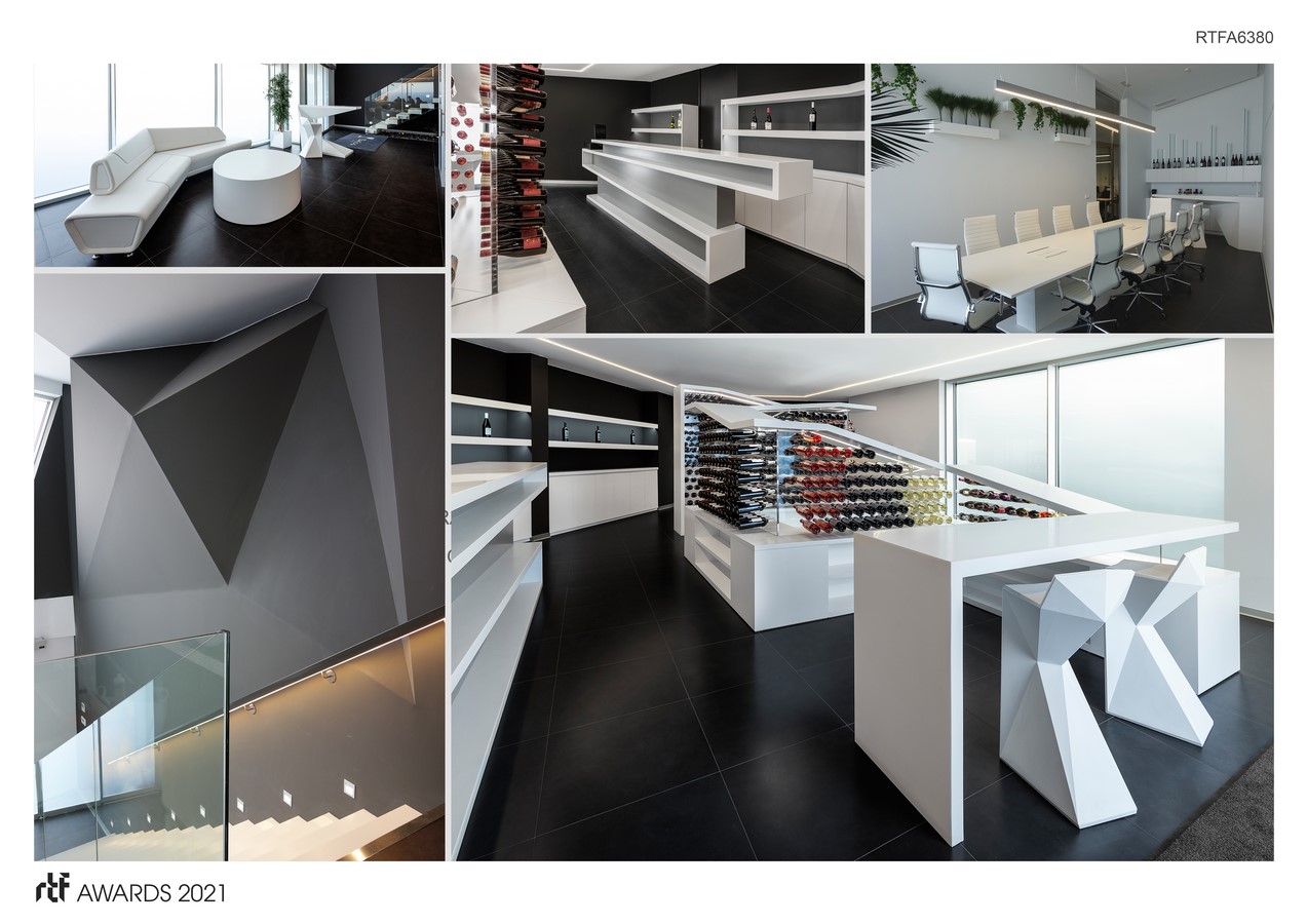 The vertical volume of black stone contains the Store destined to the sale of the bottles that the Wineries produce, although most of the production is exported to different countries. It is a store designed with a white central backlight counter with broken geometry resting on a perforated glass in which enter the necks of the bottles to expose clearly different bottlings that have the cellar.