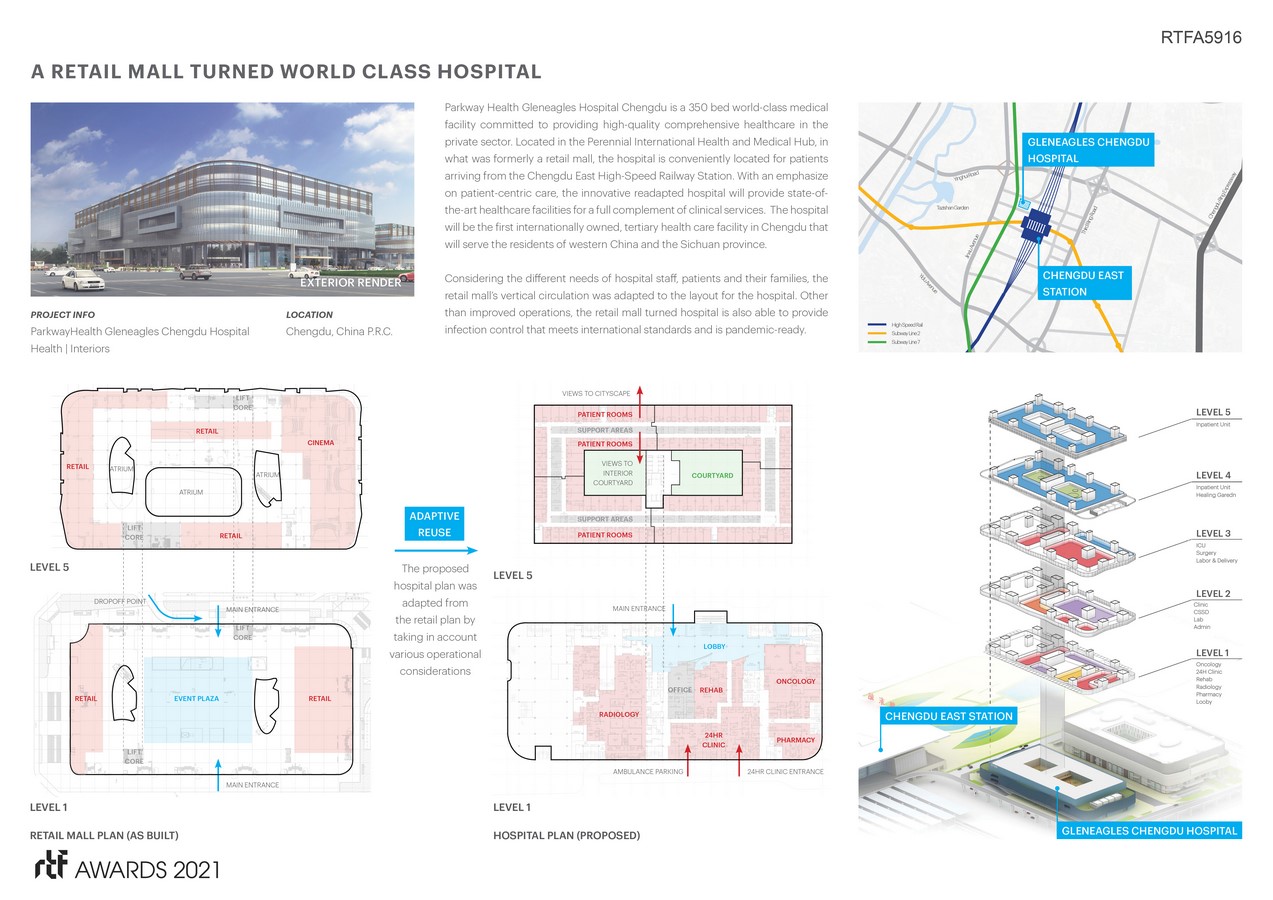 Parkway Health Gleneagles Hospital Chengdu is a 350 bed world-class medical facility committed to providing high-quality comprehensive healthcare in the private sector. Located in the Perennial International Health and Medical Hub, in what was formerly a retail mall, the hospital is conveniently located for patients arriving from the Chengdu East High-Speed Railway Station. With an emphasize on patient-centric care, the innovative readapted hospital will provide state-of-the-art healthcare facilities for a full complement of clinical services. The hospital will be the first internationally owned, tertiary health care facility in Chengdu that will serve the residents of western China and the Sichuan province.