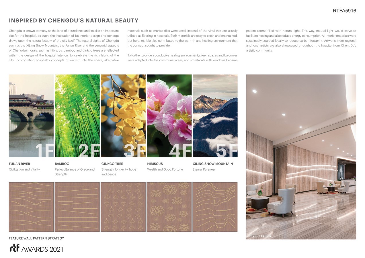 Chengdu is known to many as the land of abundance and its also an important site for the hospital, as such, the inspiration of it’s interior design and concept draws upon the natural beauty of the city itself. The natural sights of Chengdu such as the XiLing Snow Mountain, the Funan River and the sensorial aspects of Chengdu’s florals, such as hibiscus, bamboo and ginkgo trees are reflected within the design of the hospital interiors to celebrate the rich fabric of the city.