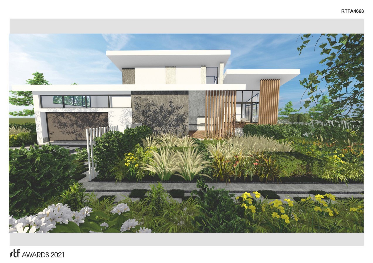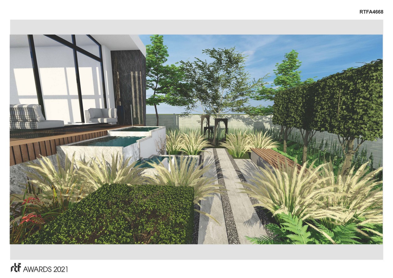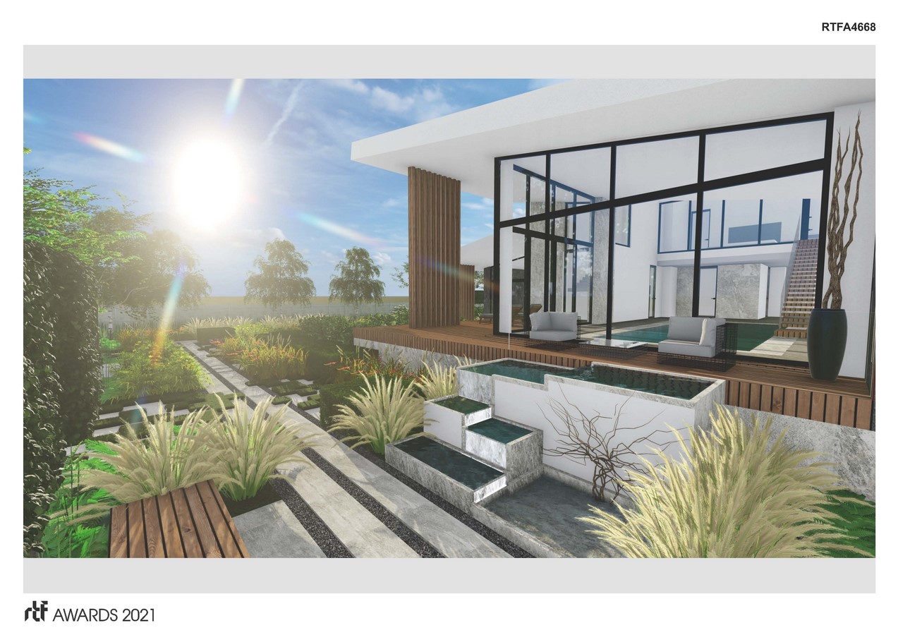 Through the panoramic windows, you can see a large swimming pool, which continues in the form of a multi-level reservoir, opening to the recreation area in the garden. In the garden, too, vertical aluminum poles are used, which echo the elements of the house.