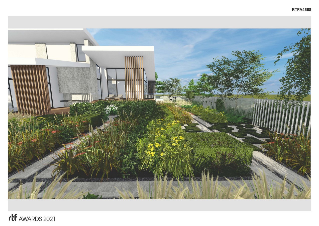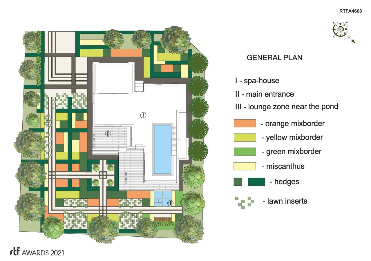 The garden is designed according to the grid method and is divided into squares and rectangles. The garden was filled with hedges and cut cubes, cereals, yellow and orange mixborders, which give volume, soften the pressure of straight lines and combine with the wooden elements of the building in color.