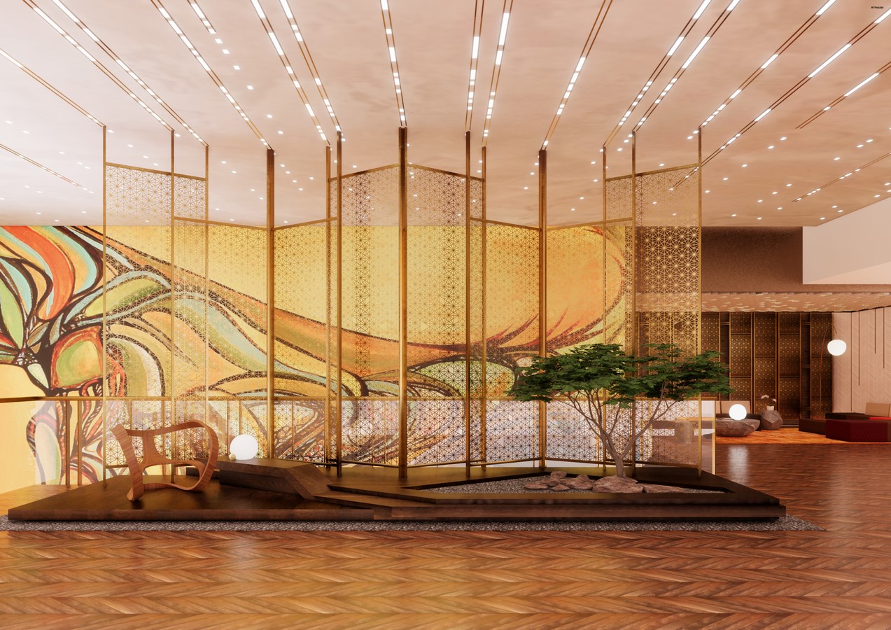 A Zen garden sits in the transitional space between the front desk and elevator lobby, greeting visitors and occupants alike with a reminder of another culture. The striking art piece on the wall behind the garden is adaptation of an original work chosen by the firm.