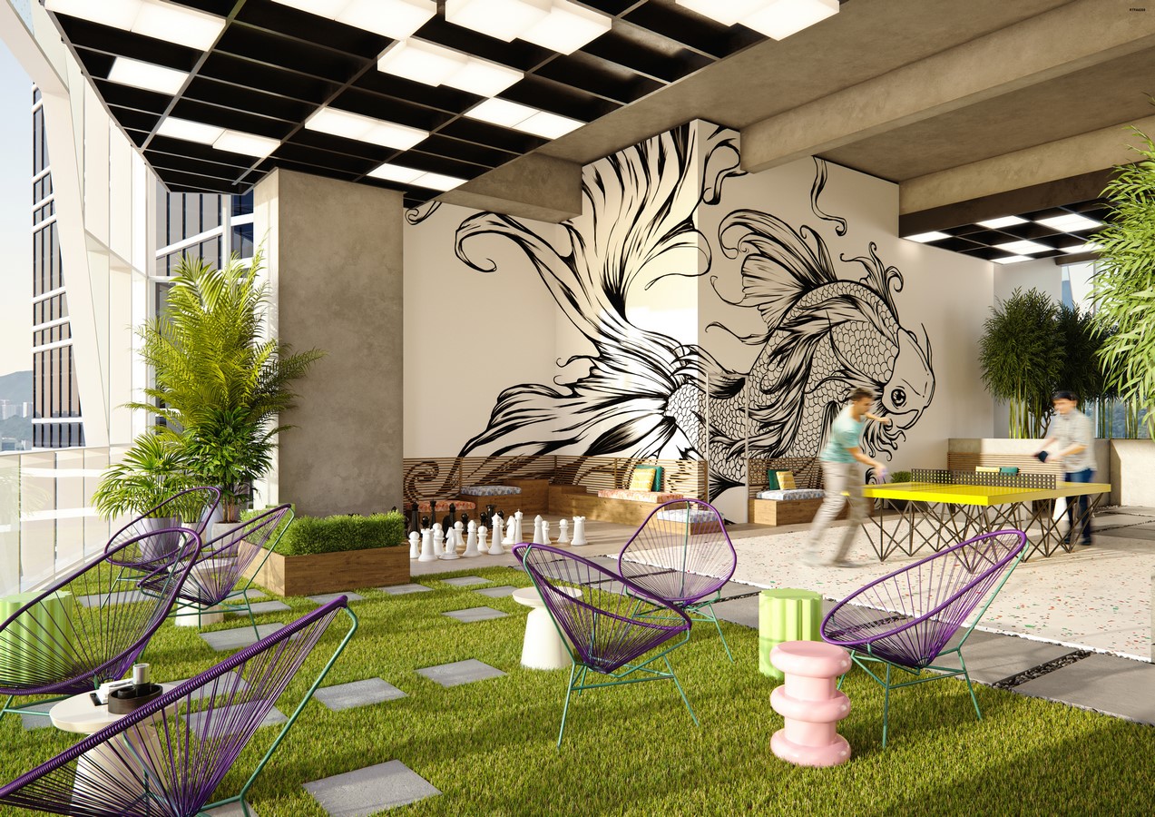 A sky garden was created on the sixteenth floor, offering building occupants a place of refuge and respite. Multiple seating areas were created, each with their own distinct look and feel, inspired by various travel destinations around the world.