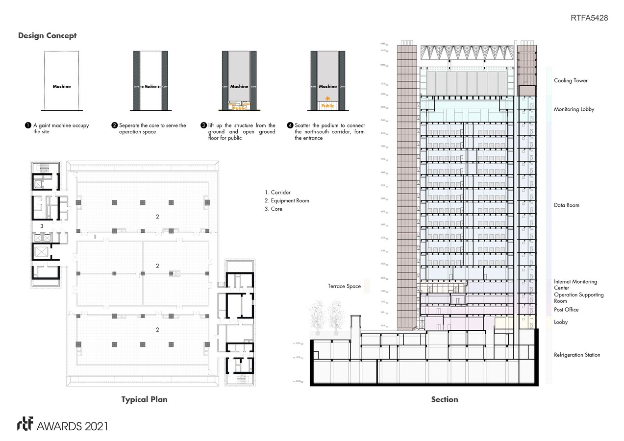 Such an infrastructure building would normally resemble a giant machine – a windowless block, that fails to relate to its urban surroundings. To compensate for this lack of interaction, the lower floors have been planned as an inviting, open lobby area, integrating a post office as well. Its presence ensures that the building will contribute to the public life of the city. The majority of stories are machine rooms, with up to 3515 data units. Controlling and monitoring units are located on the top floor.