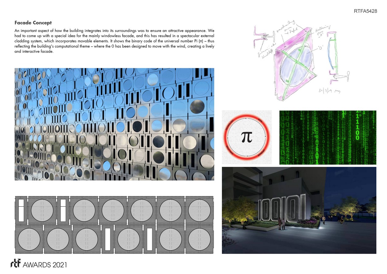 An important aspect of how the building integrates into its surroundings was to ensure an attractive appearance. We had to come up with a special idea for the mainly windowless facade, and this has resulted in a spectacular external cladding system, which incorporates movable elements. It shows the binary code of the universal number Pi (π) – thus reflecting the building’s computational theme – where the 0 has been designed to move with the wind, creating a lively and interactive facade.