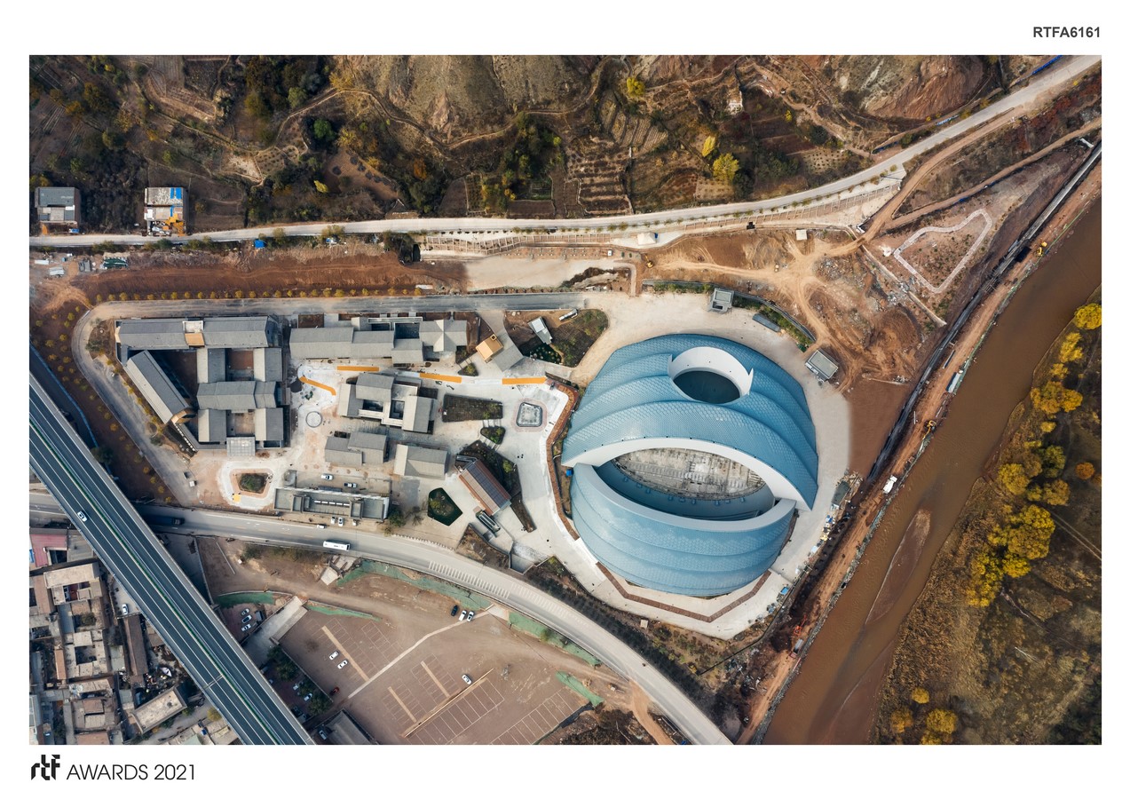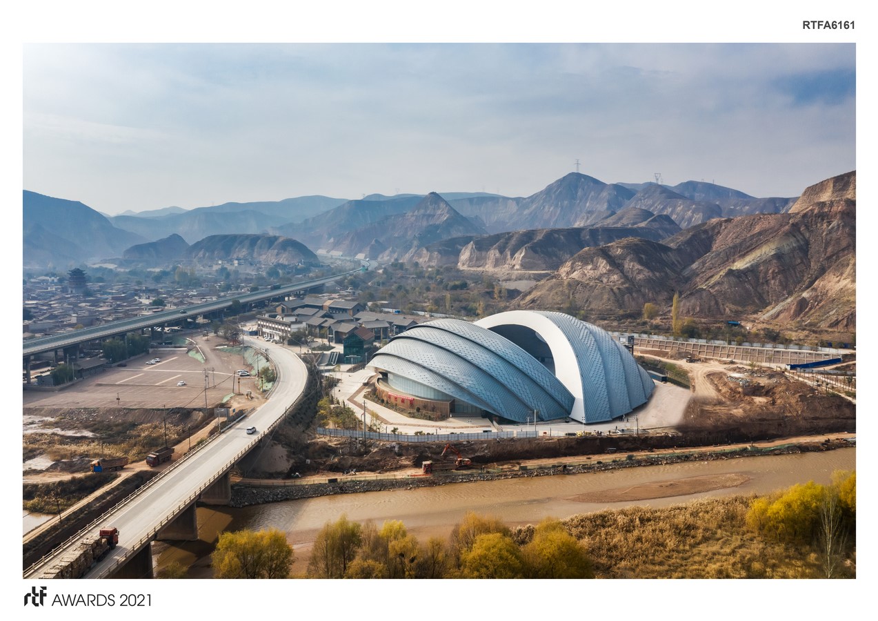 The roof surface adopts a metal plate cladding. As the project is adjacent to a traditional ancient village, Hekou Ancient Town, the exterior shape of the theatre integrates the elements of the local traditional buildings, with the roof arrangement layer upon layer just like it. The outer roof claddings are like the wings of a giant bird, covering and overlaying from top to bottom with rhyme. The materials with similar texture as the tiles are adopted for the roof decorative panels. The local traditional materials such as bricks, woods, rammed earth, etc., are adopted for the finishing surface of other parts of the building, fully making the building fit in the local natural and cultural environment. All these components are contributing to put this building on Lanzhou’s map as a major landmark.