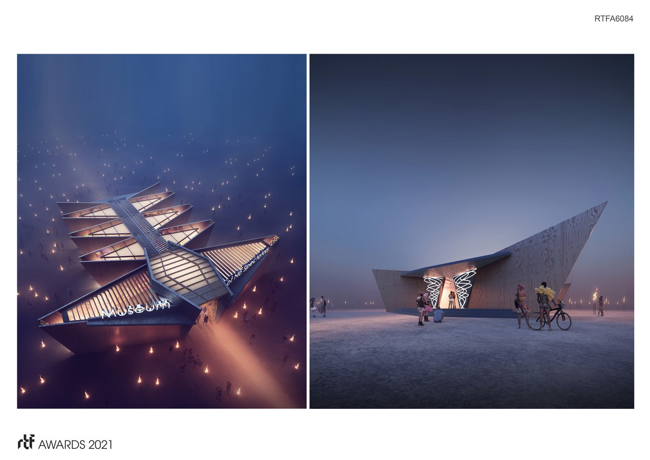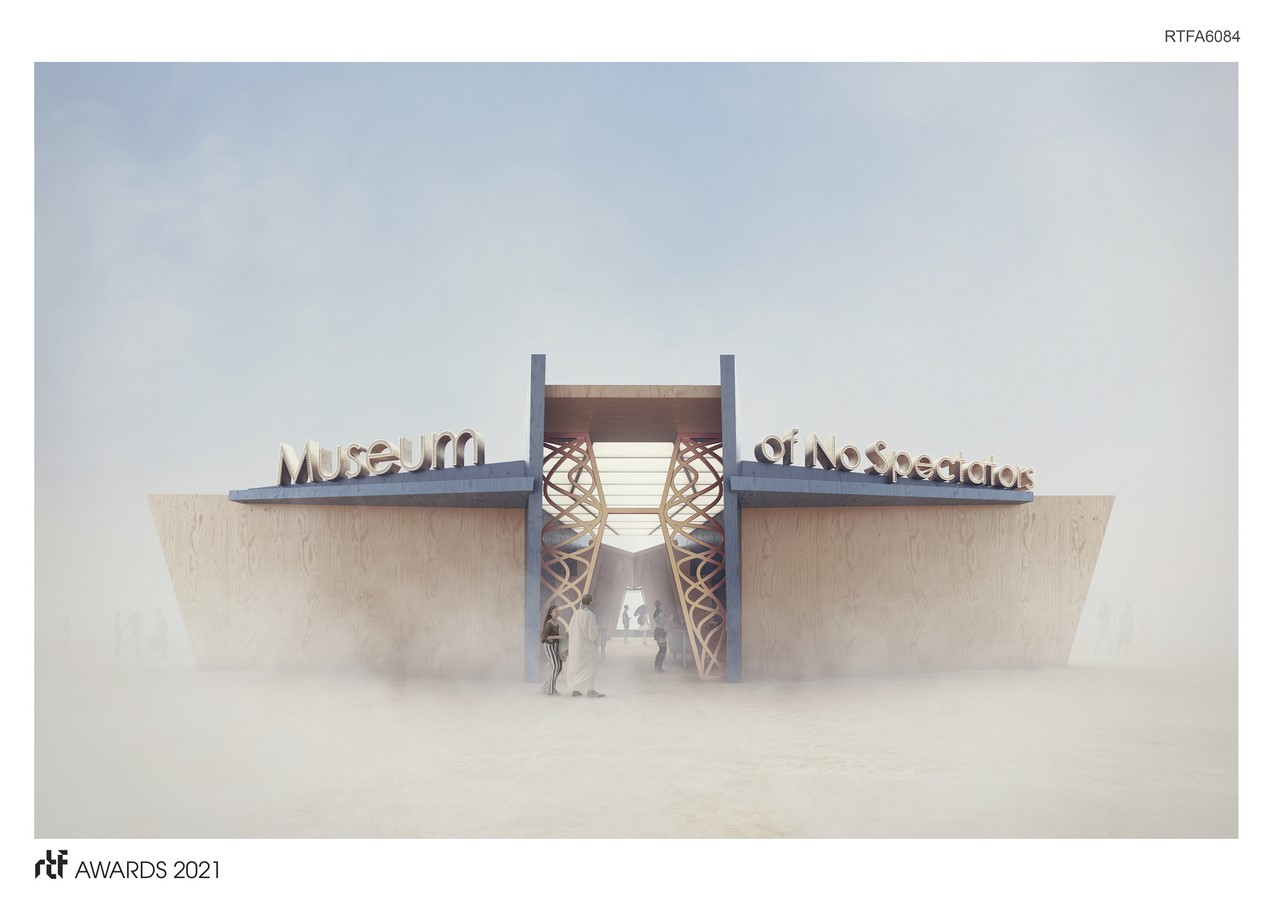 Out near the dusty perimeter of Black Rock City lies a different kind of museum. As you approach this intriguing and mysterious building with its unusually shaped galleries, appearing part machine, part creature, part abstract and surrealistic form, it may present as a blank slate, with an expansive exterior, the letters spelling Museum of No Spectators hovering above. Its dynamic shapes emerge as otherworldly yet grounded. It is waiting for you to approach and become a part of it….. to participate.