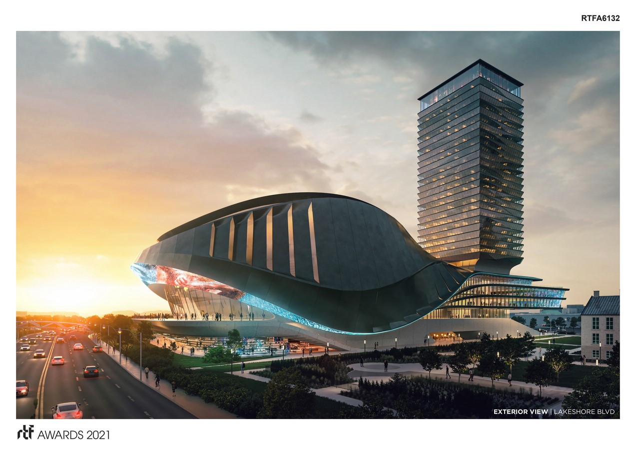 Situated on the hallowed grounds of Exhibition Place in Toronto, the performance venue and hotel is uniquely positioned to deliver exceptional entertainment and hospitality to Torontonians and visitors from around the world. The building massing provides for a compelling composition – the performance venue delivers an iconic presence along the waterfront and the hotel serves as the anchor of the composition, unifying the two building programs yet allowing for separate and distinct internal functions.