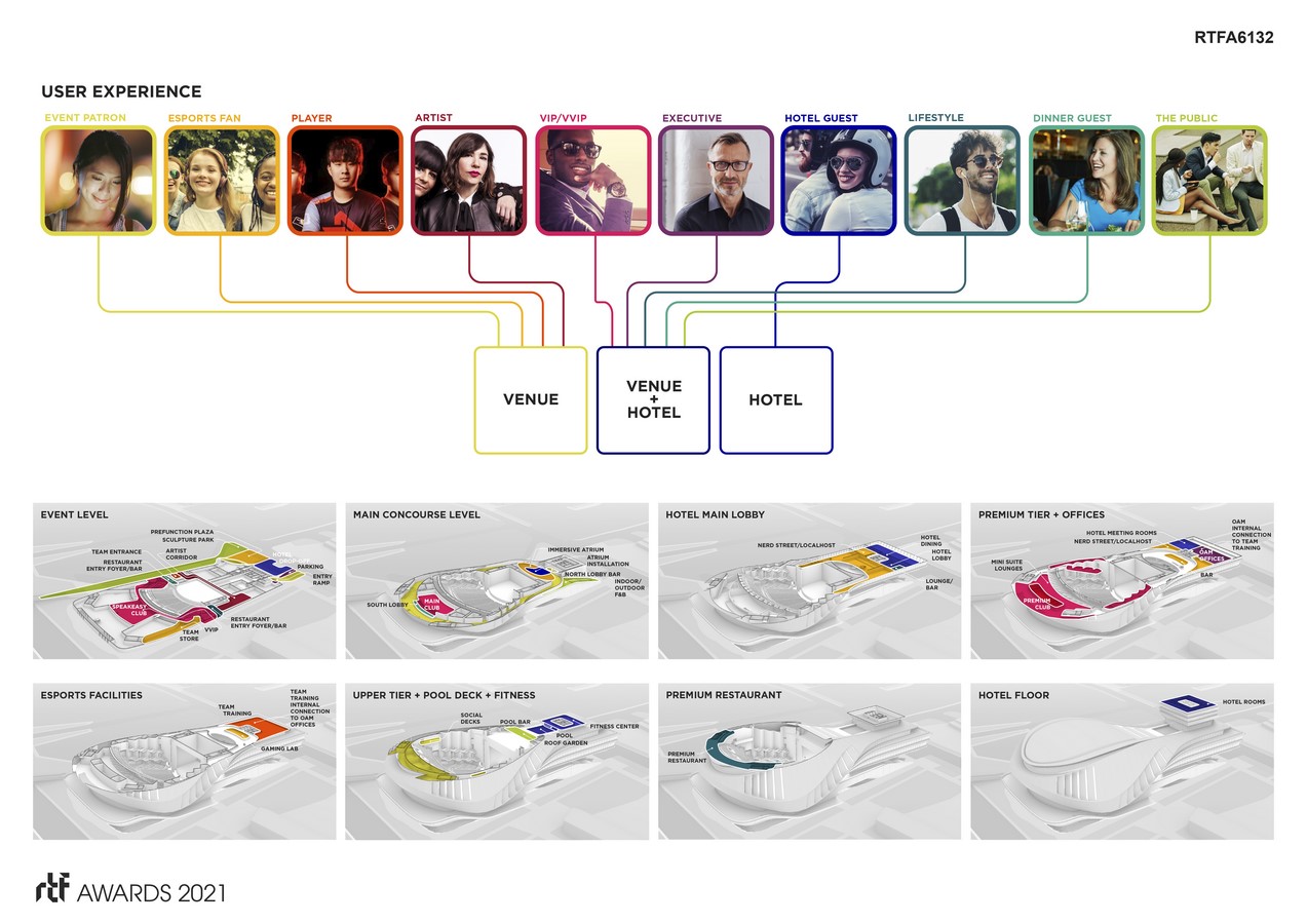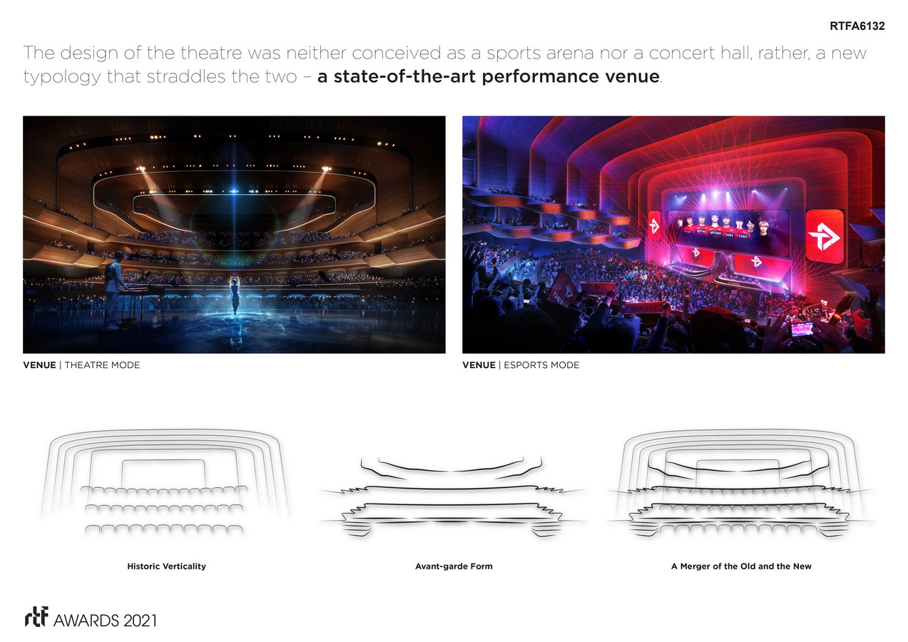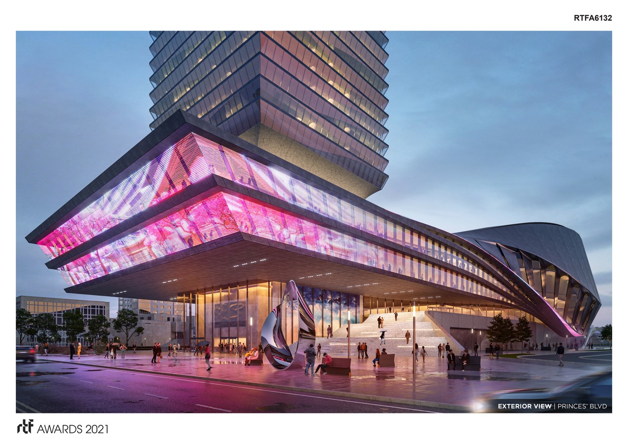 A key attribute to the site is its pedestrian access. The design allows for pedestrian movement along its entire eastern and western elevations as well as the ascension of the public onto the podium’s southern porch – a prominent open space with stunning views. Once inside the venue, the interactive pre-function hall serves as a mixing bowl for venue patrons, hotel guests, business executives, performers/entertainment, esports gamers and staff.