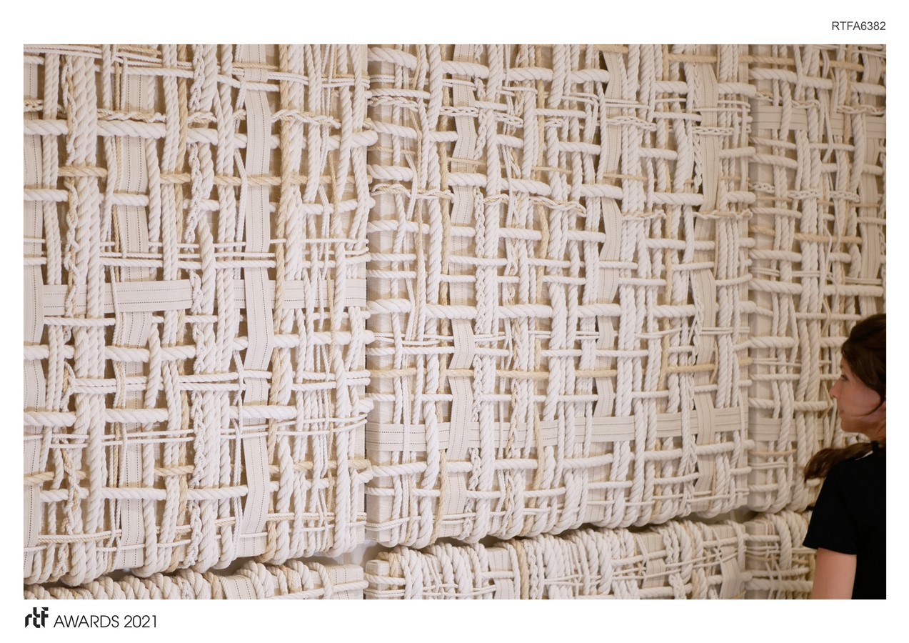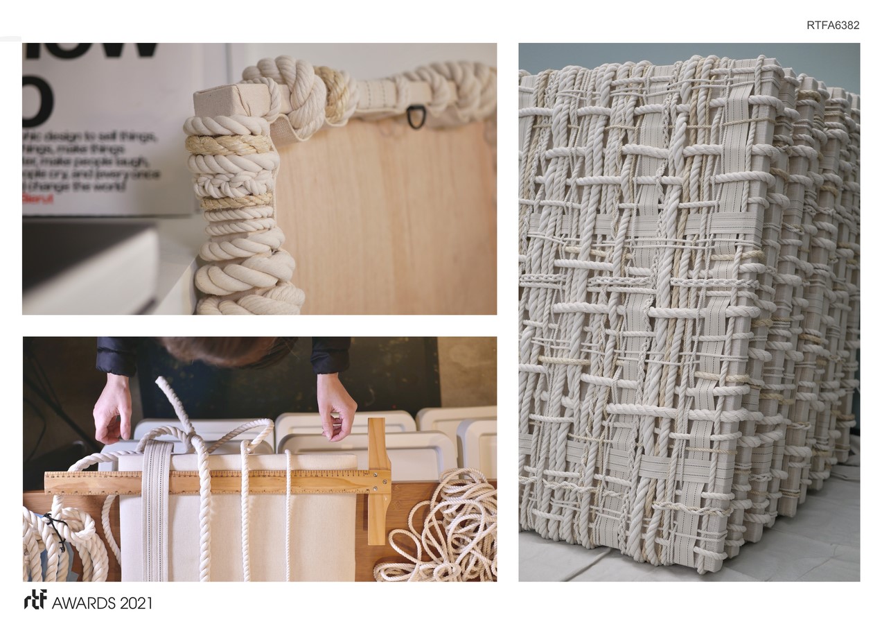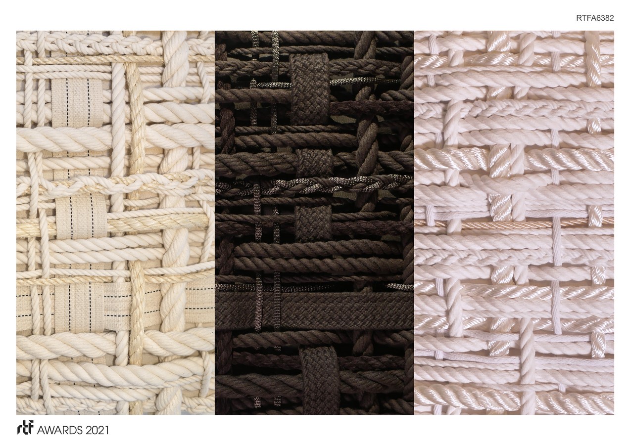 Flame resistant with nearly no VOCs, they are woven from a combination of cotton, chenille, and sisal ropes. Product colors are offered in natural, all-black, and snow white, with optional detailing of luxe buffalo leather or satin cord. Variations are in development for outdoor applications like coastal properties that expand on the all-natural ethos but sustain under inclement weather.