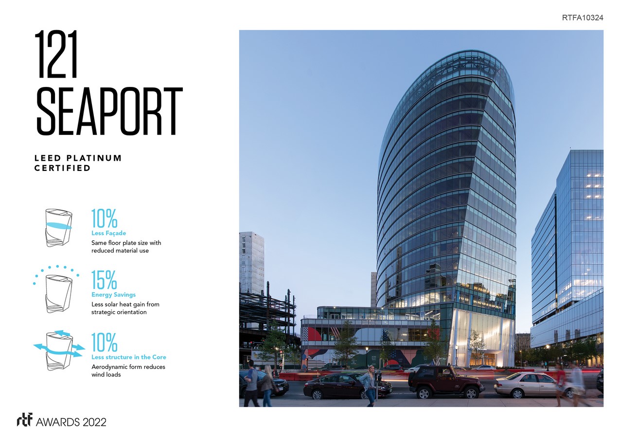- In plan, the form of the building is similar to an airplane wing in that the tower’s orientation is strategically positioned for strong winter winds to flow around, rather than into, the building. 121 Seaport’s off-grid orientation reduces wind loads on the structure, also allowing for a reduction in the amount of steel and concrete in the core.